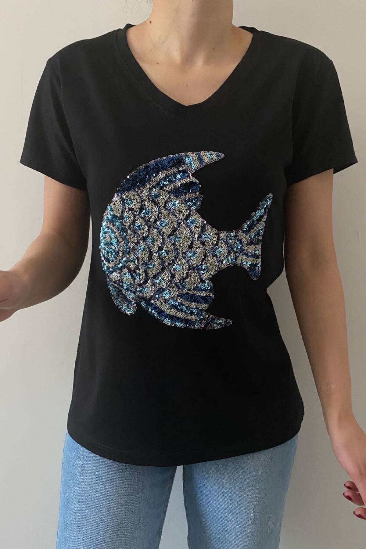 Tüy Desenli Pul Payet V-yaka T-shirt Tüy Desenli Pul Payet V-yaka T-shirt LadTy01 L