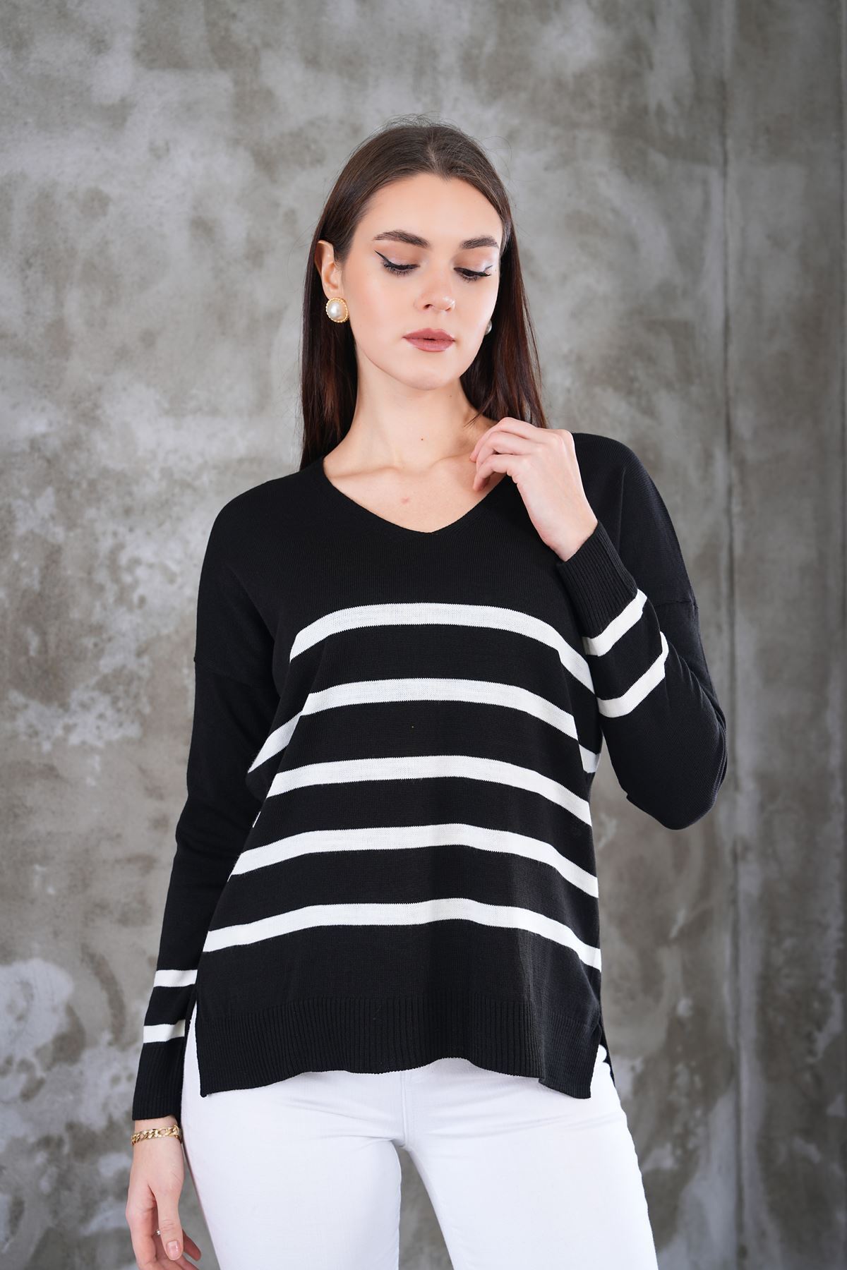 Kadın Ekru V Yaka Çizgili Önü Kisa Arkasi Uzun Kazak ARM-20K012008 Kadın Ekru V Yaka Çizgili Önü Kisa Arkasi Uzun Kazak ARM-20K012008 Standart