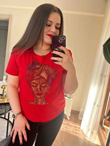 Crystal Taşlı Pamuk Kısa Kol Bisiklet Yaka Büyük Beden Kırmızı Kadın T-shirt Crystal Taşlı Pamuk Kısa Kol Bisiklet Yaka Büyük Beden Kırmızı Kadın T-shirt 742 3XL