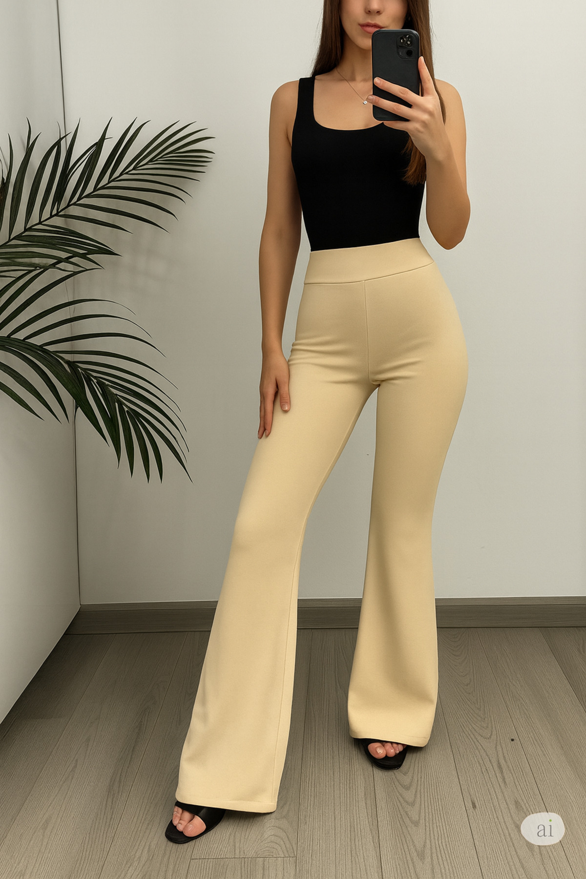 Yüksel Bel İspanyol Paça Duble Kumaş Pantolon - Bej Yüksel Bel İspanyol Paça Duble Kumaş Pantolon - Bej MS00ANT11111 L/40