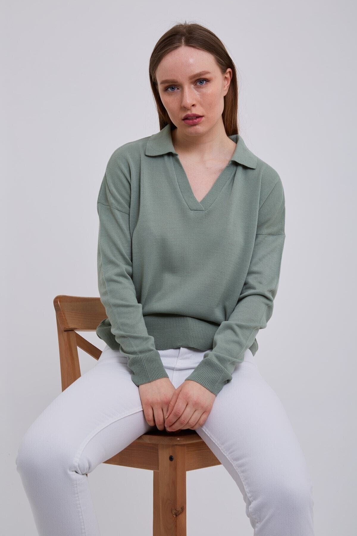 Kadın Polo Yaka Çizgili Triko Kazak Camel-beyaz Kadın Polo Yaka Çizgili Triko Kazak Camel-beyaz BSRPOLO Standart