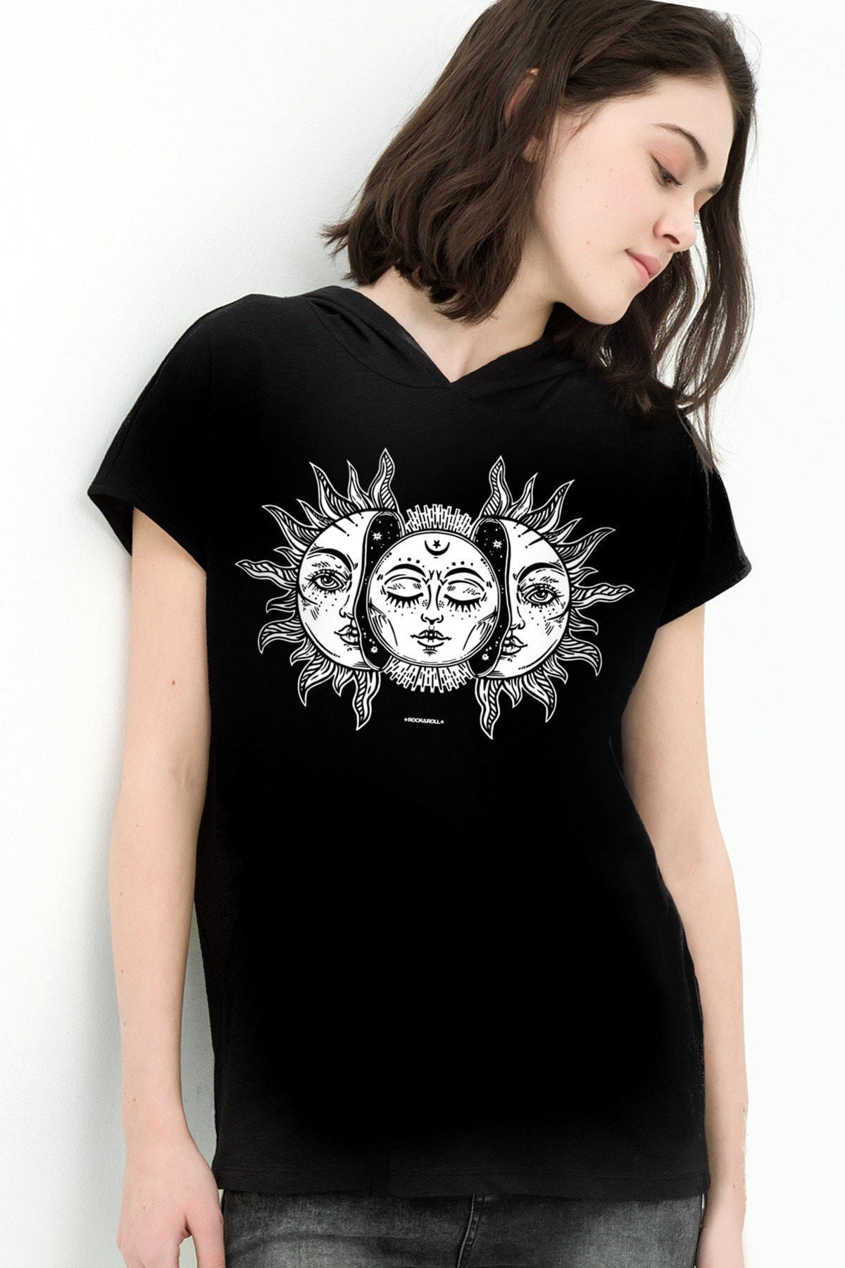 Kadın Siyah Kapüşonlu Rahat Kesim Kanguru Cepli Kısa Kollu Penye T-shirt Kadın Siyah Kapüşonlu Rahat Kesim Kanguru Cepli Kısa Kollu Penye T-shirt 387 3XL