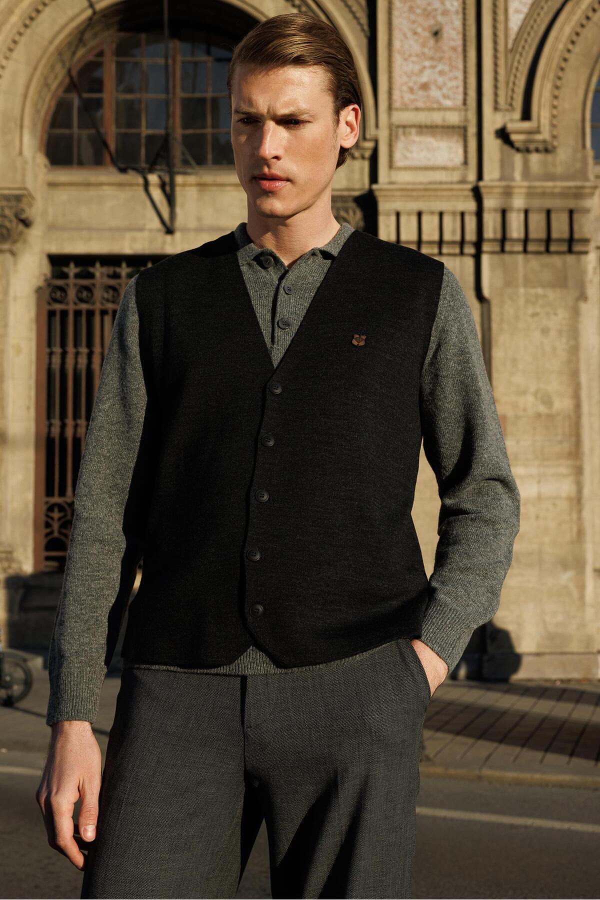 Erkek V Yaka Keçe Aksesuarlı Pike Dokuma Yün Yelek Siyah Erkek V Yaka Keçe Aksesuarlı Pike Dokuma Yün Yelek Siyah 22569 4XL