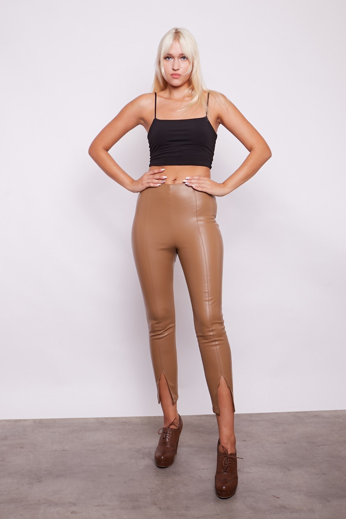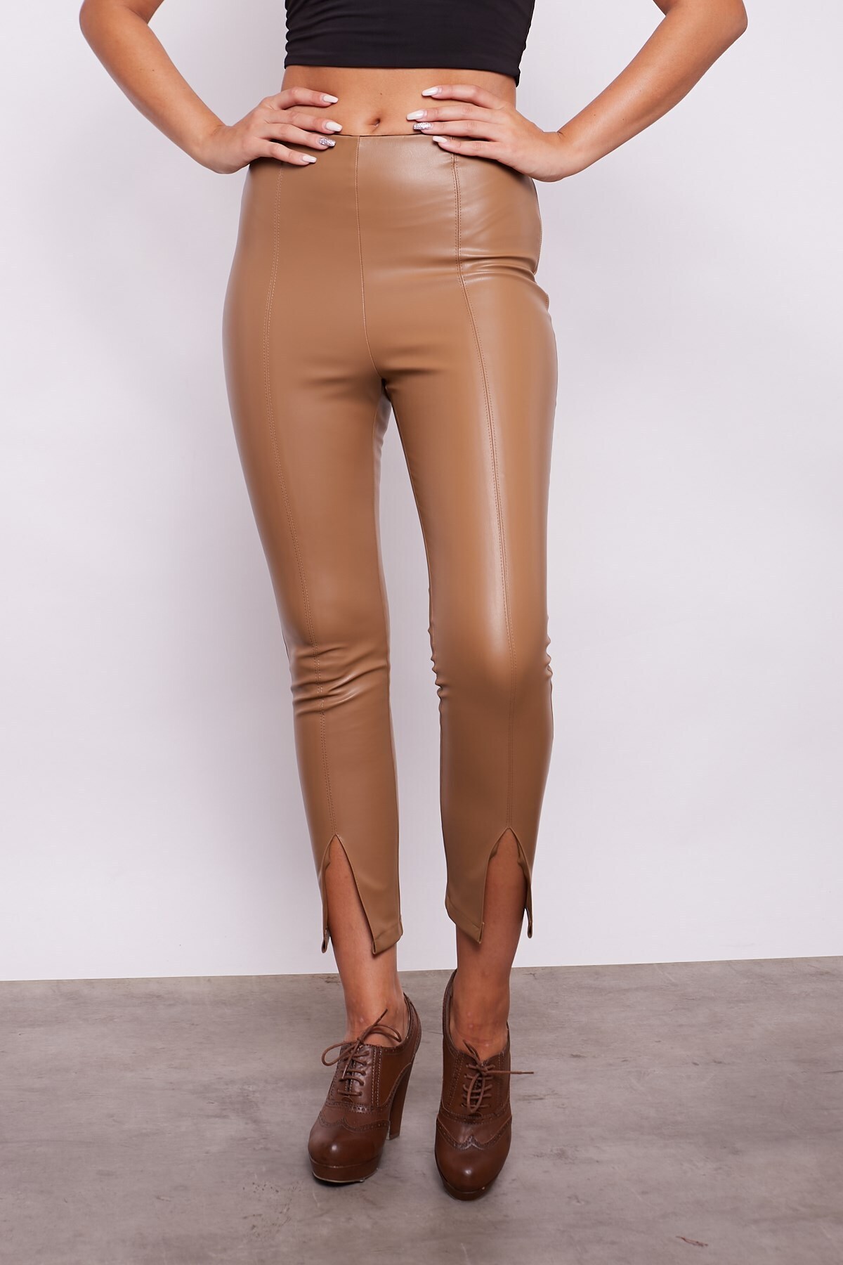 Ekolojik Suni Deri Yüksek Bel Dar Paçalı Önü Yırtmaçlı Pantolon -Koyu Bej Ekolojik Suni Deri Yüksek Bel Dar Paçalı Önü Yırtmaçlı Pantolon -Koyu Bej 40053 42