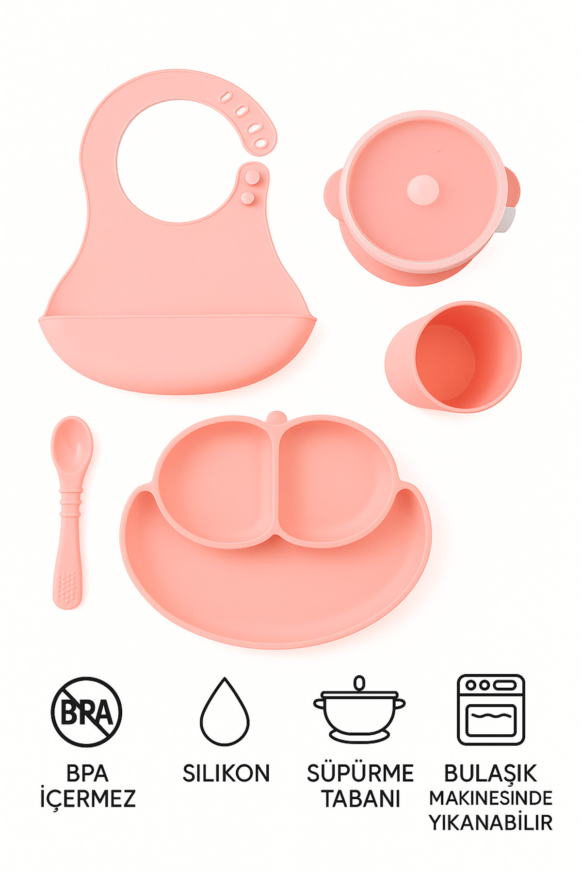 Silikon Beslenme Seti Vakumlu Silikon Mama Tabağı, Mama Kasesi, Önlük, Kaşık, Pipetli Bardak Silikon Beslenme Seti Vakumlu Silikon Mama Tabağı, Mama Kasesi, Önlük, Kaşık, Pipetli Bardak JSMT10004 تک سایز