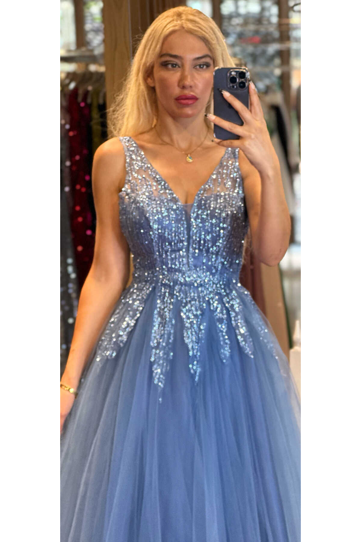 İndigo Kalın Askı Kloş Etekli Tül Uzun Abiye Elbise 6871 İndigo Kalın Askı Kloş Etekli Tül Uzun Abiye Elbise 6871 TR6871 48