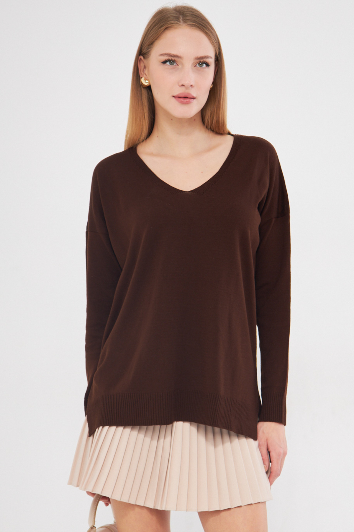 Kadın Kahve V Yaka Ön Kısa Arkası Uzun Triko Kazak ARM-22Y012013 Kadın Kahve V Yaka Ön Kısa Arkası Uzun Triko Kazak ARM-22Y012013 Standart