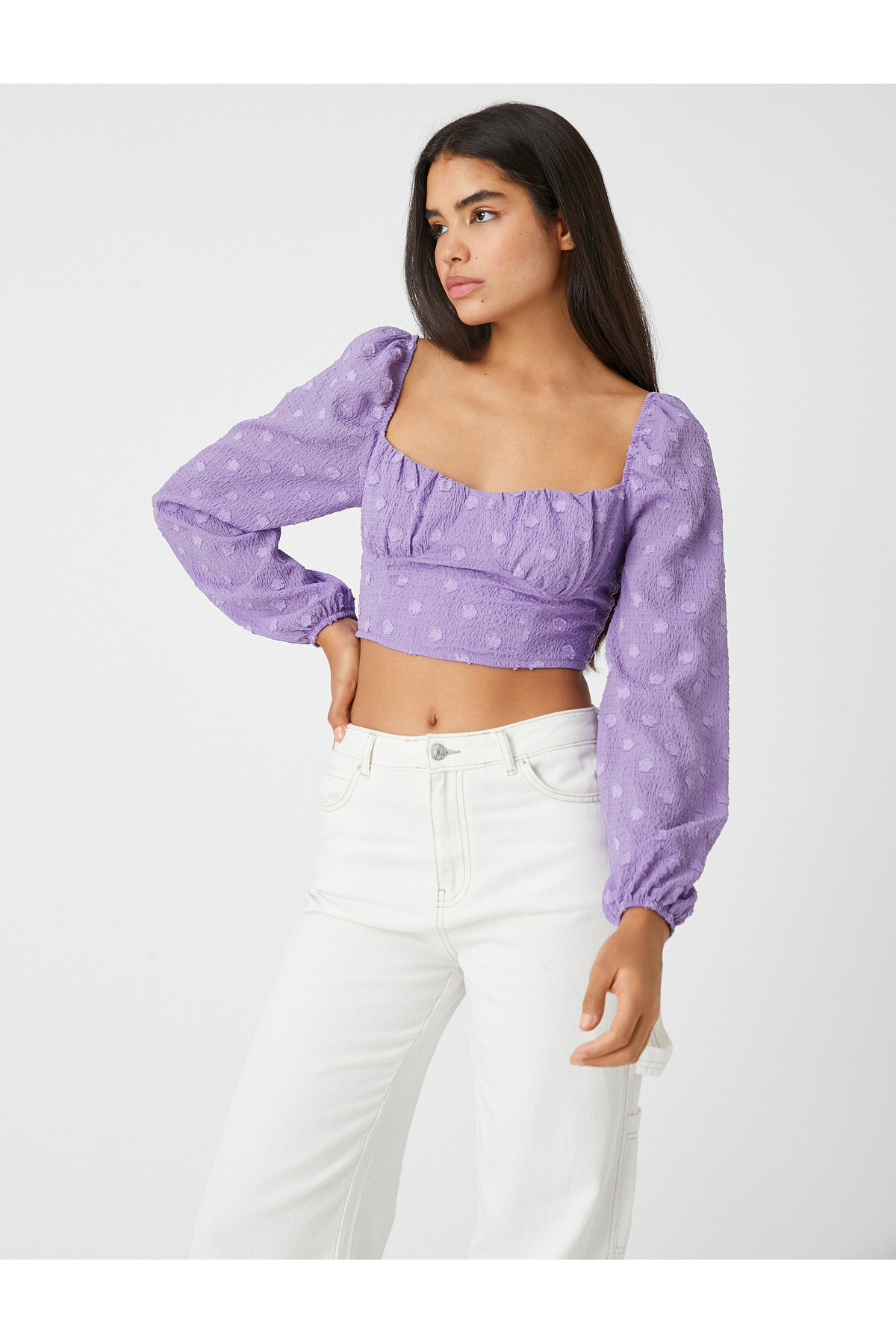 Crop Bluz Balon Kollu Dokulu Crop Bluz Balon Kollu Dokulu 3WAL60091IW 40