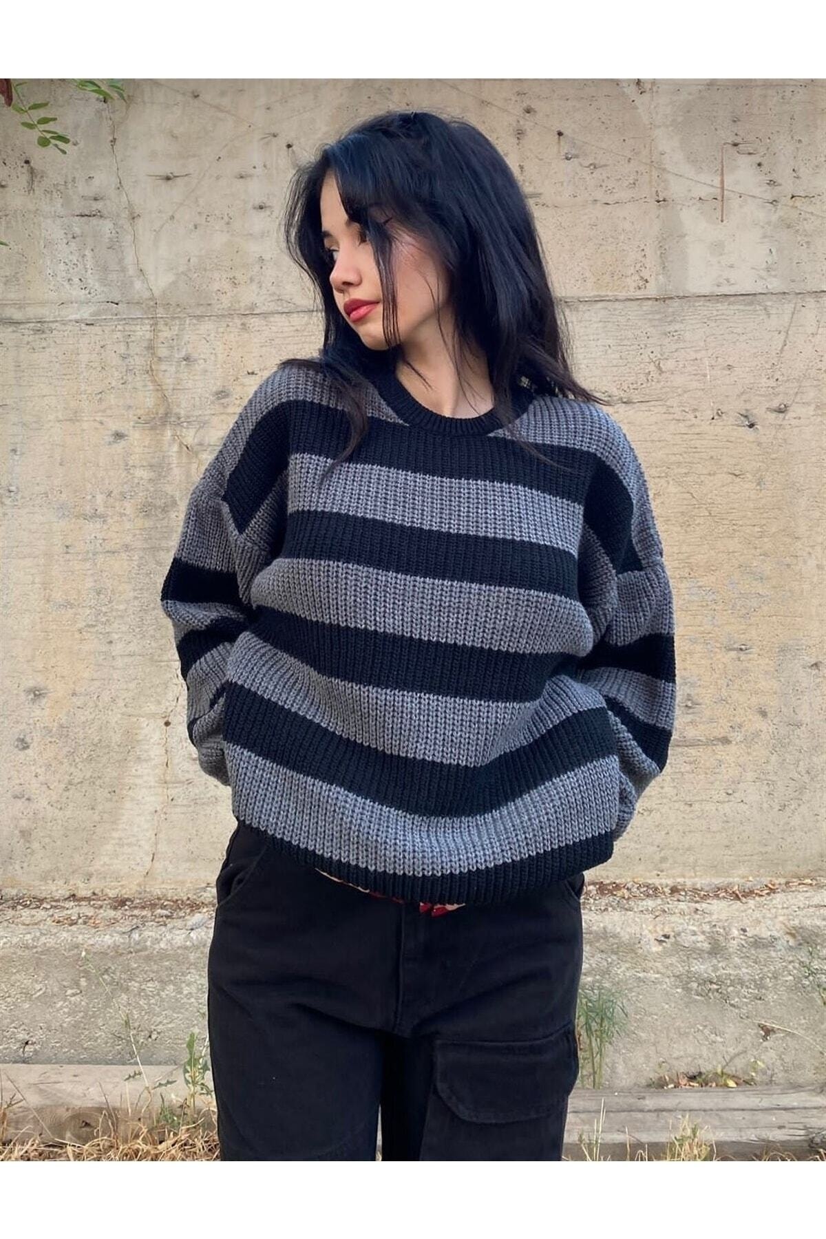 Gri Siyah Çizgili Streetwear Oversize Triko Kazak Gri Siyah Çizgili Streetwear Oversize Triko Kazak TYC00575591151 Standart