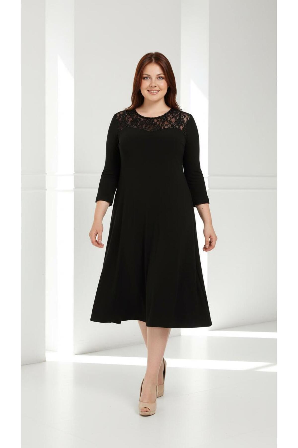 Büyük Beden Siyah Inci Işli Kadife Abiye Elbise-4072s Büyük Beden Siyah Inci Işli Kadife Abiye Elbise-4072s 54