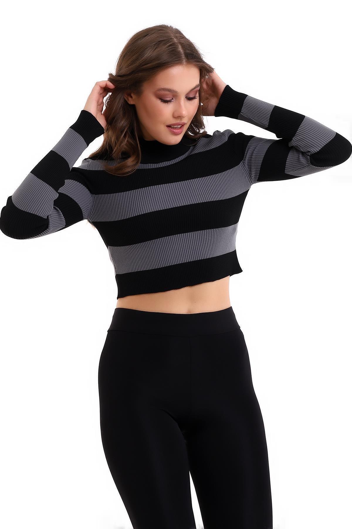Kadın Siyah-gri Çizgili Triko Crop Kazak Triko Bluz 1101 Kadın Siyah-gri Çizgili Triko Crop Kazak Triko Bluz 1101 XL