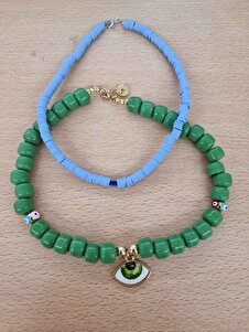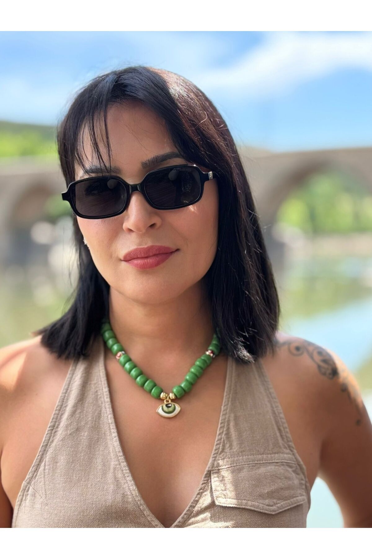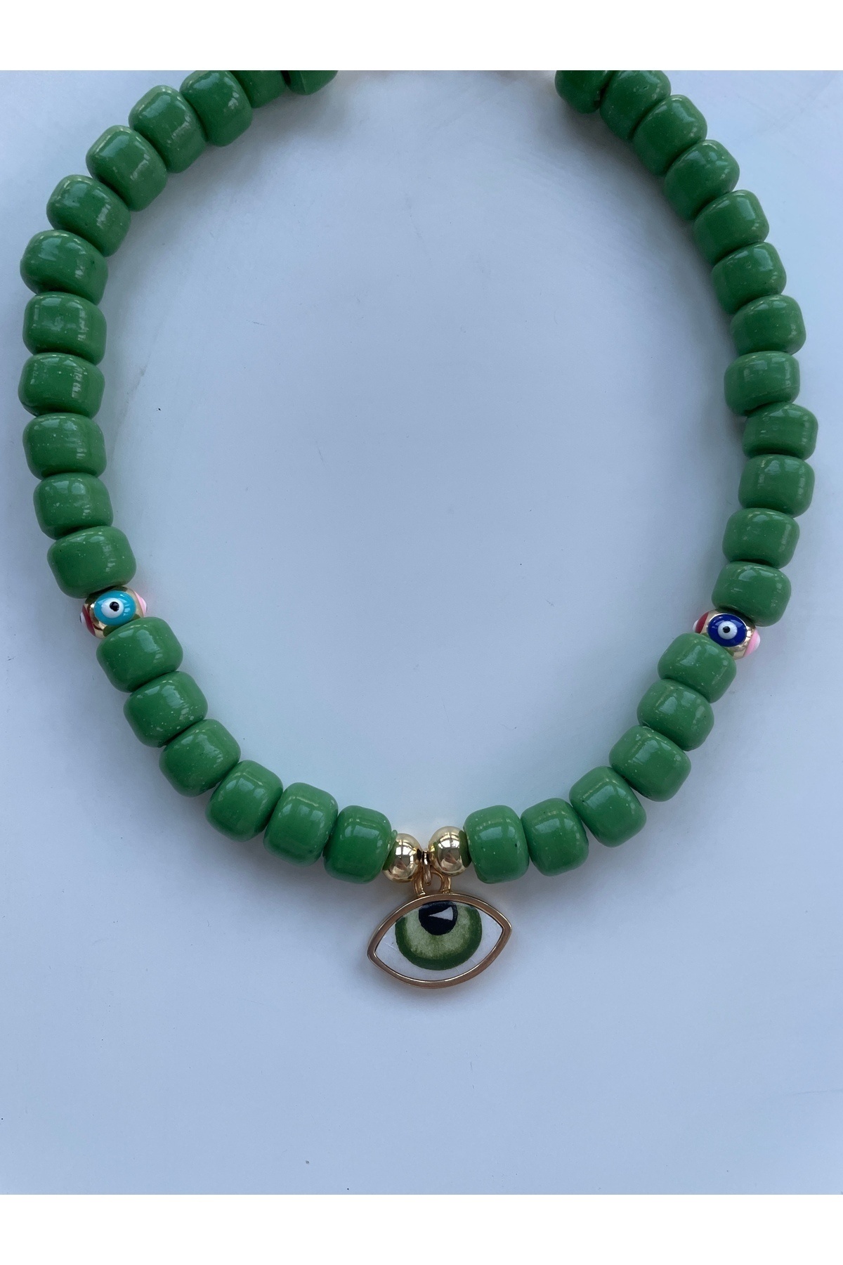 Yeşil Bodrum Boncuklu Kolye, Porselen Göz,ve Gold Detaylı Yeşil Bodrum Boncuklu Kolye, Porselen Göz,ve Gold Detaylı AYN4 تک سایز