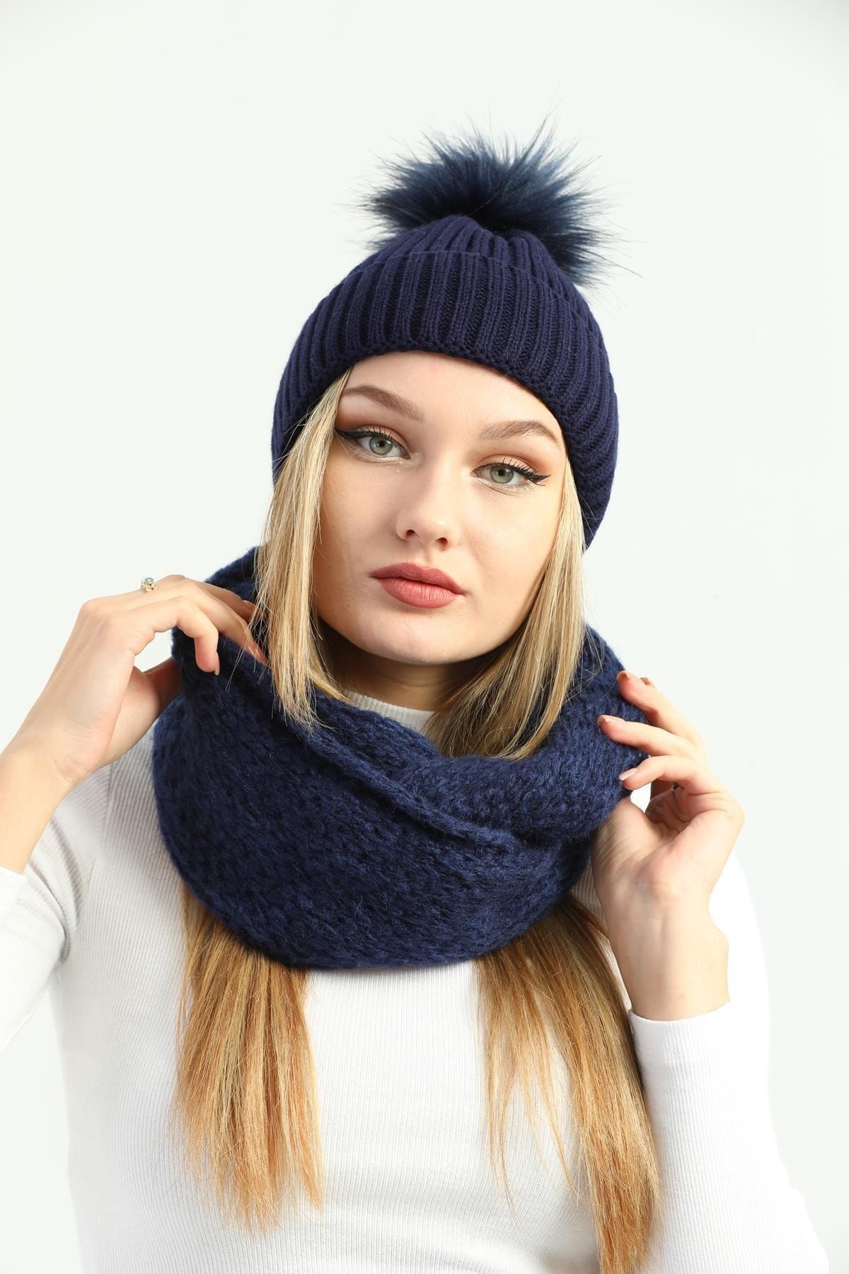 Kadın Kışlık Lacivert Ponponlu Triko Bere Kadın Kışlık Lacivert Ponponlu Triko Bere EIG-BR4 Standart