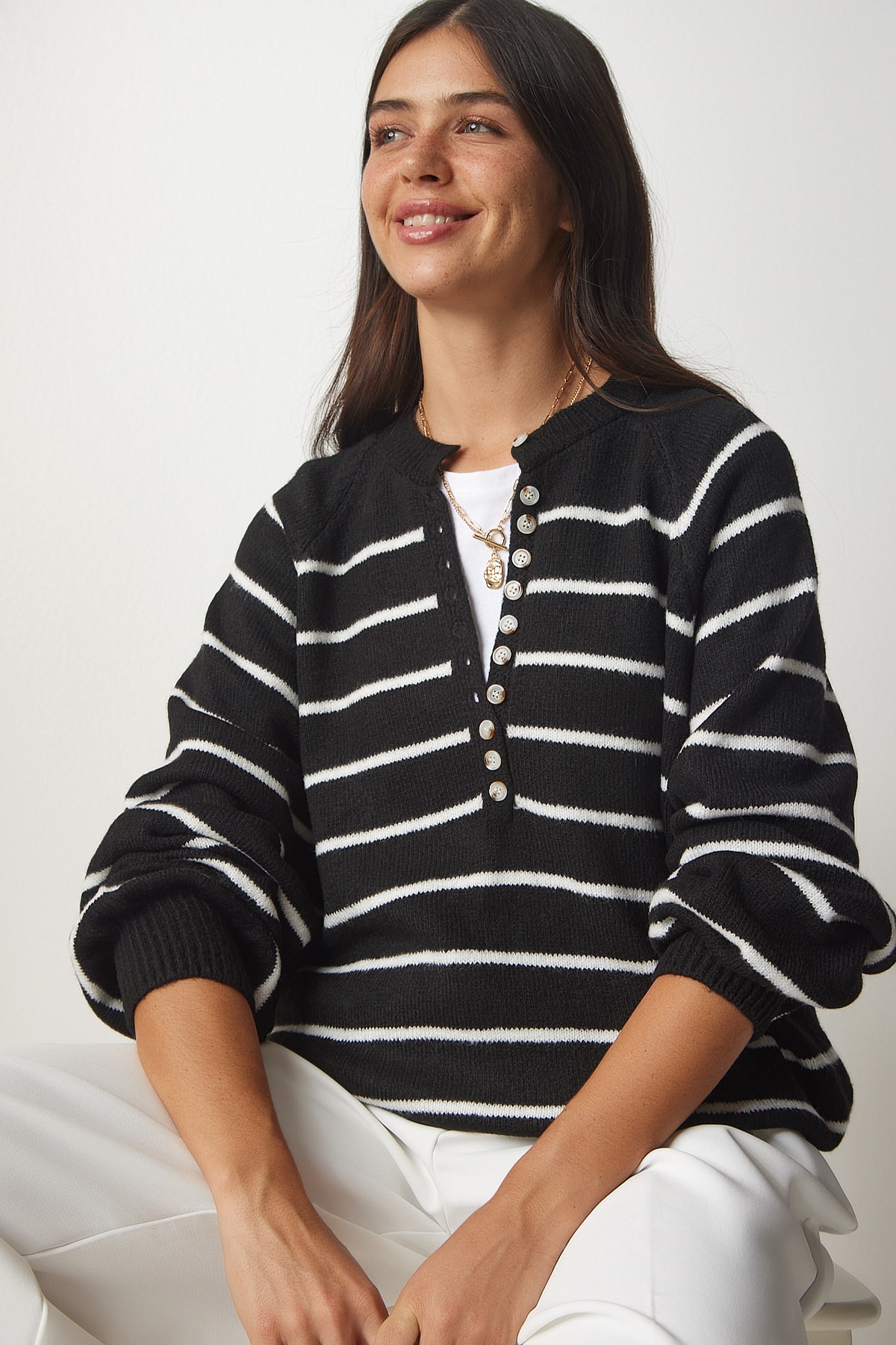 Kadın Kemik Siyah Düğmeli Yaka Çizgili Triko Kazak LX00040 Kadın Kemik Siyah Düğmeli Yaka Çizgili Triko Kazak LX00040 Standart