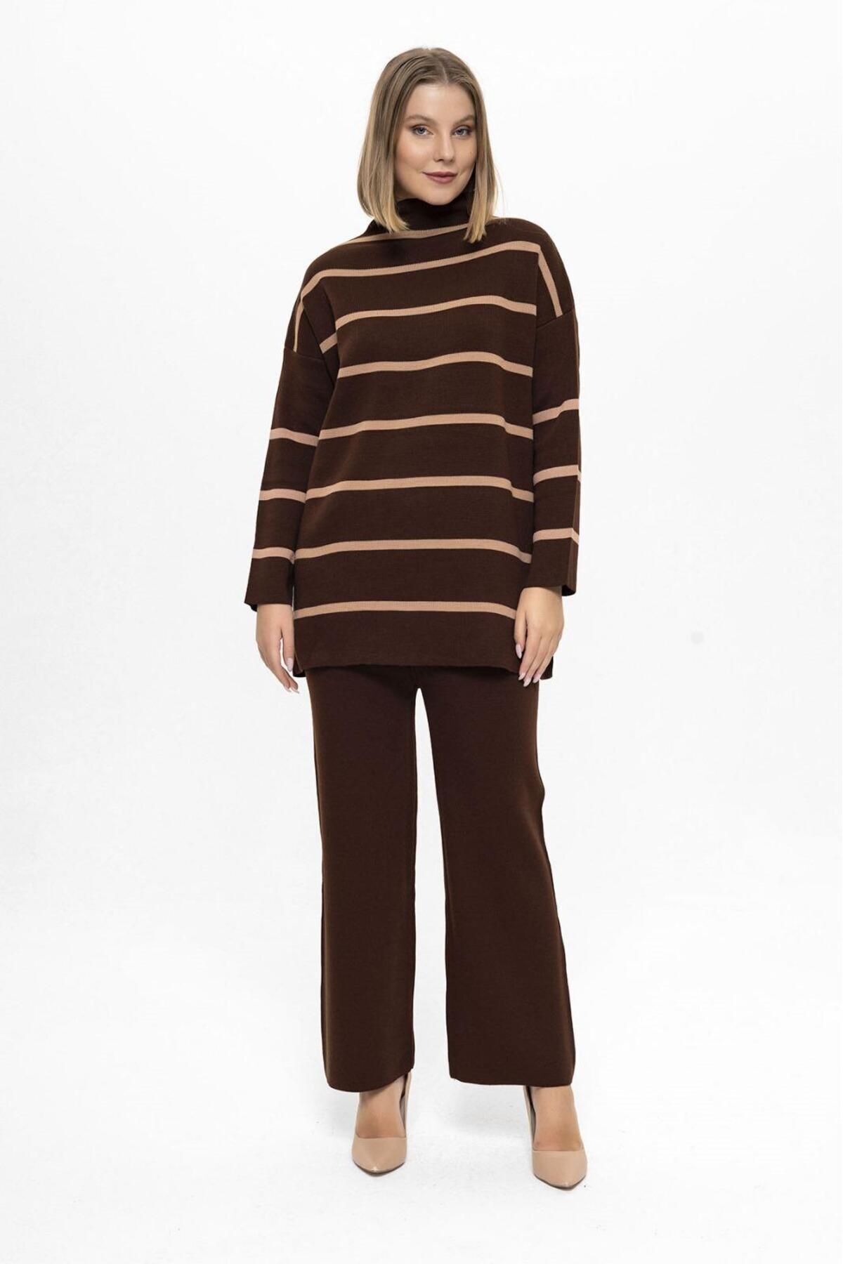 Kadın Polen Çizgili Triko Pantolon Ve Tunik Takım Kadın Polen Çizgili Triko Pantolon Ve Tunik Takım Luz3001 تک سایز