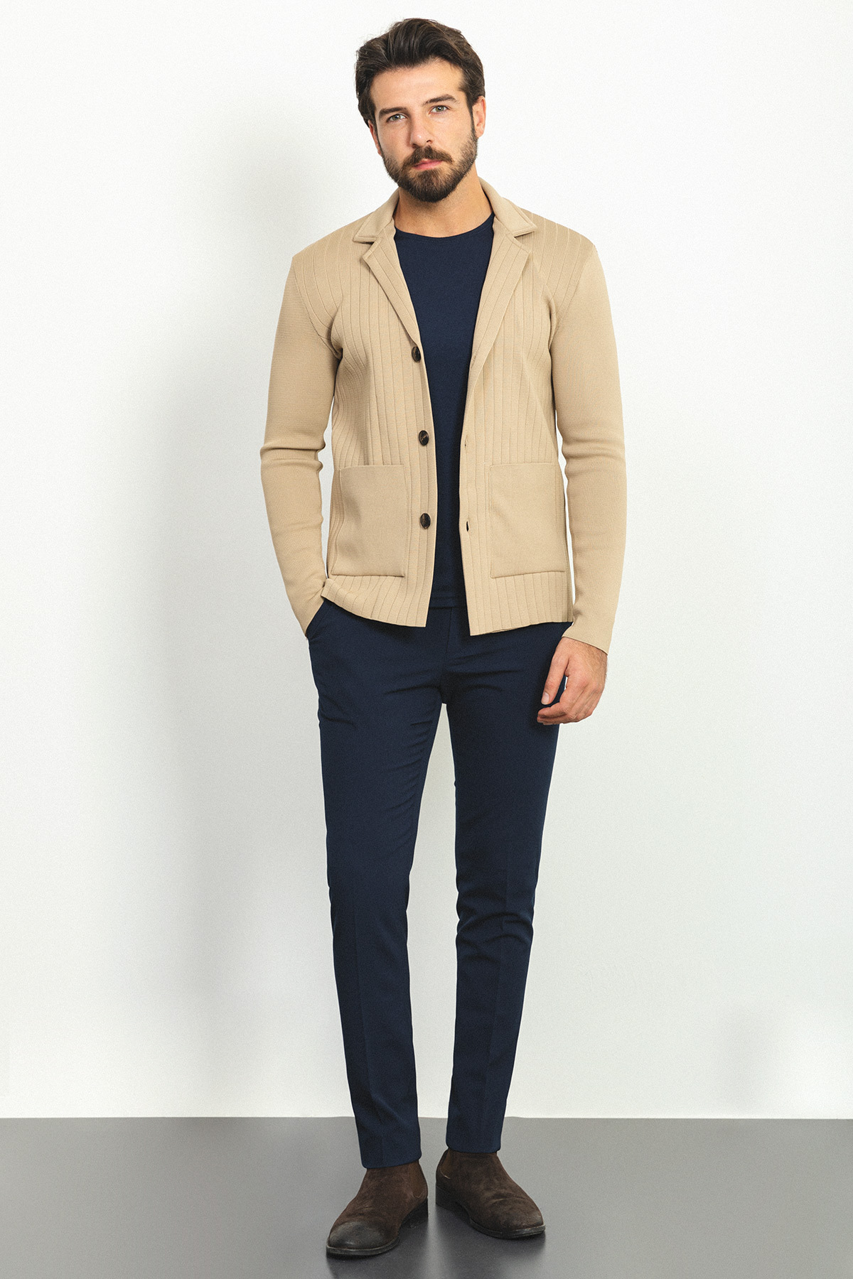 Çizgili Torba Cep Slim Fit Yün Erkek Triko Ceket Bej - 11230.22K Çizgili Torba Cep Slim Fit Yün Erkek Triko Ceket Bej - 11230.22K 2XL