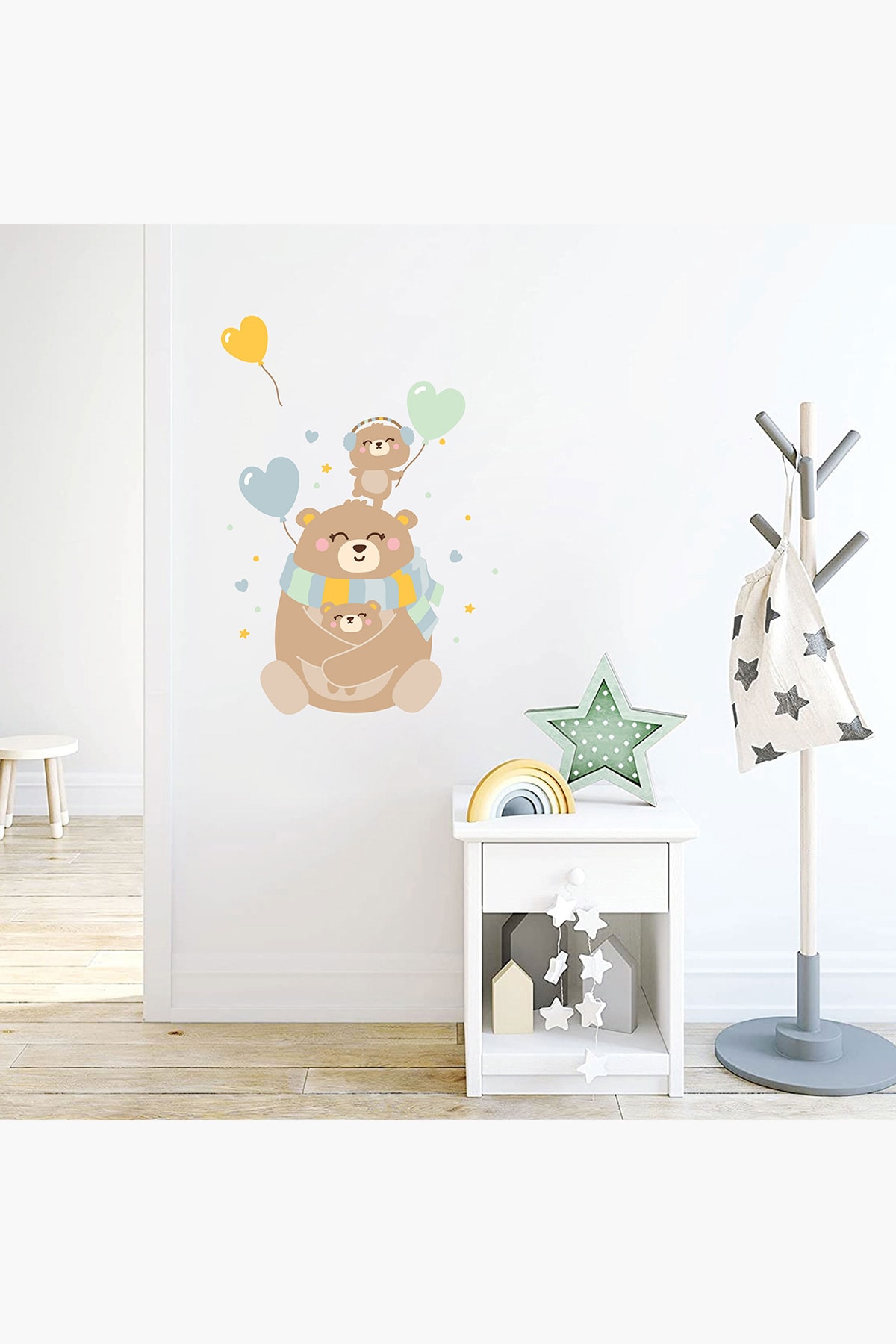 Mutlu Ayı Ailesi Ve Balonlar Duvar Sticker, Ayıcıklar Duvar Sticker, Bebek Ve Çocuk Odası Dekorasyon