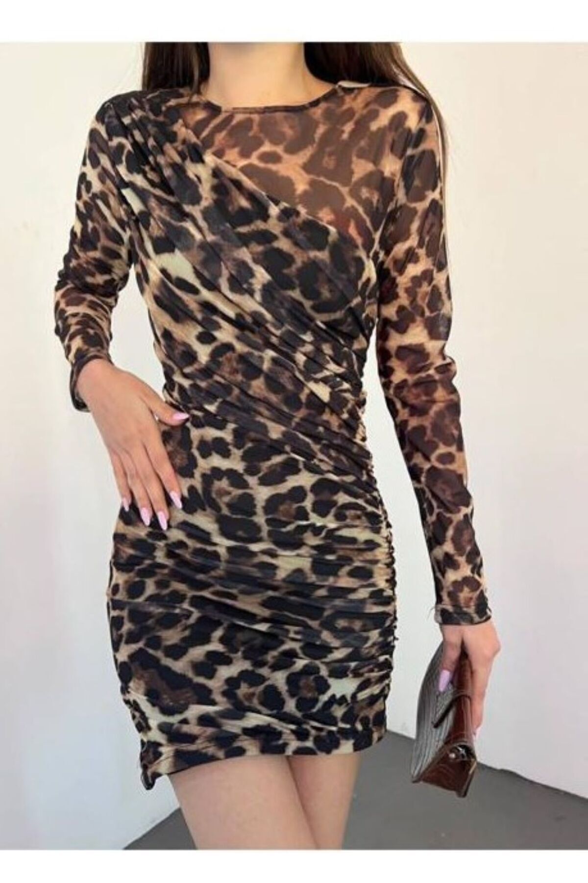 Hakim Yaka Leopar Desen Şifon Elbise Kahve Hakim Yaka Leopar Desen Şifon Elbise Kahve MSQZ23K31778 M
