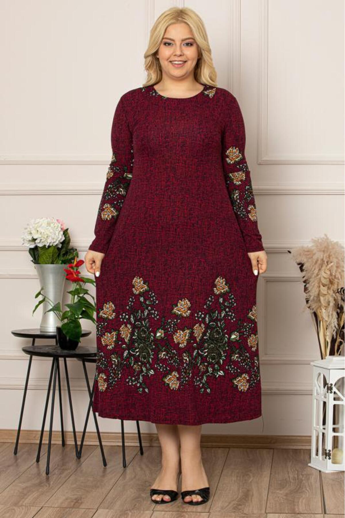 Kadın Bordo Çiçek Desen Uzun Esnek Krep Elbise Kadın Bordo Çiçek Desen Uzun Esnek Krep Elbise 5082 52-54