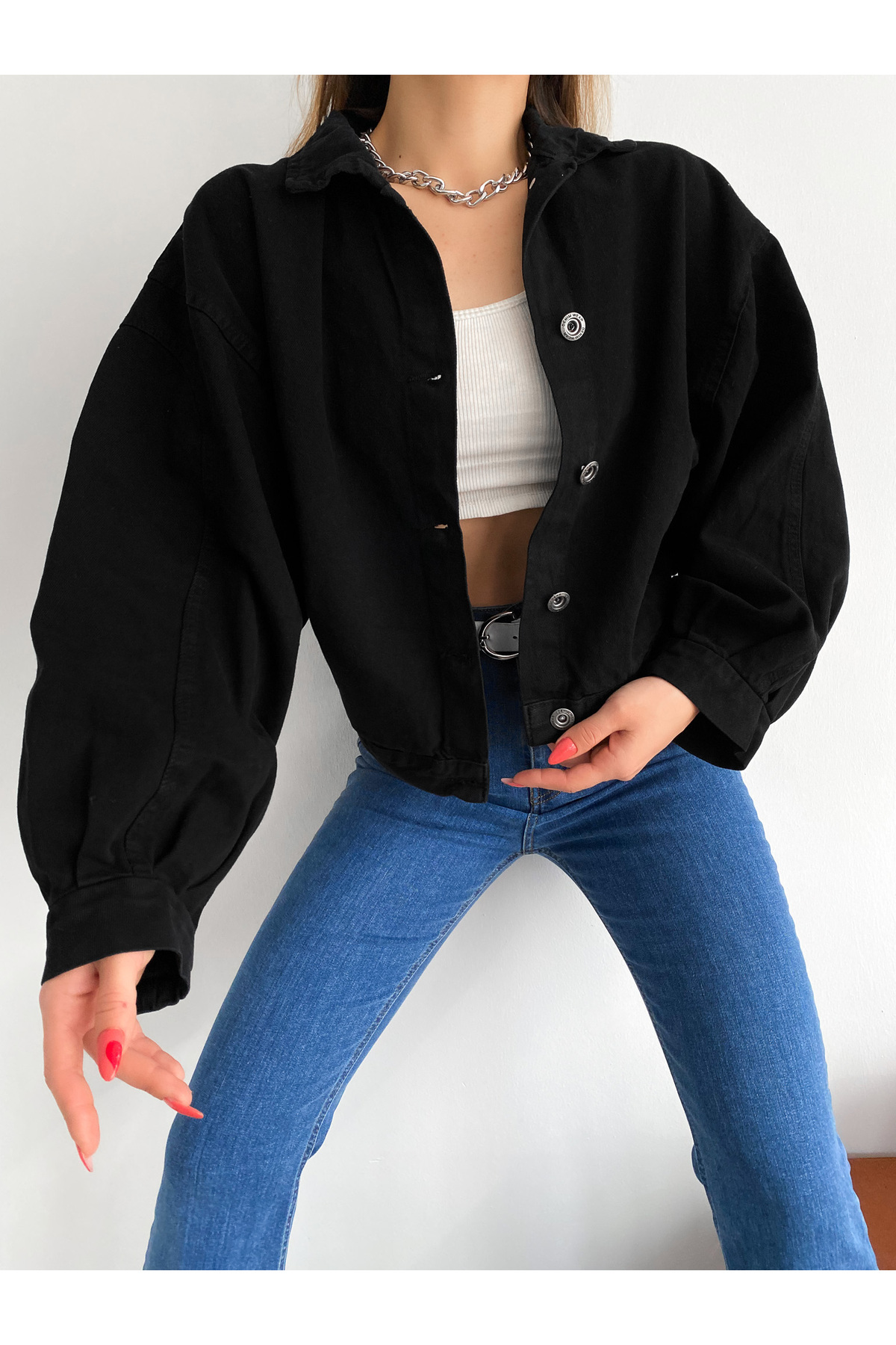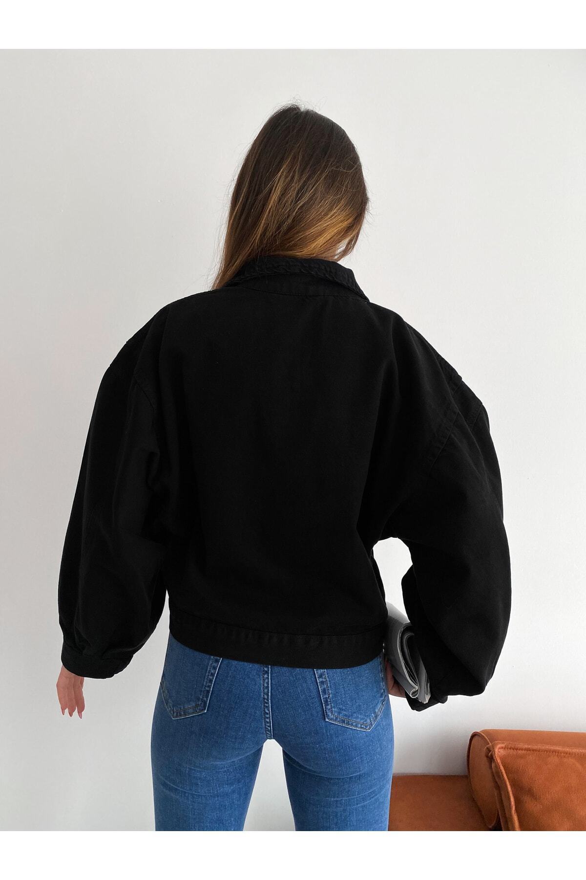 Kadın Balon Kol Oversize Çift Cepli Denim Ceket Siyah Kadın Balon Kol Oversize Çift Cepli Denim Ceket Siyah CKT0005 L