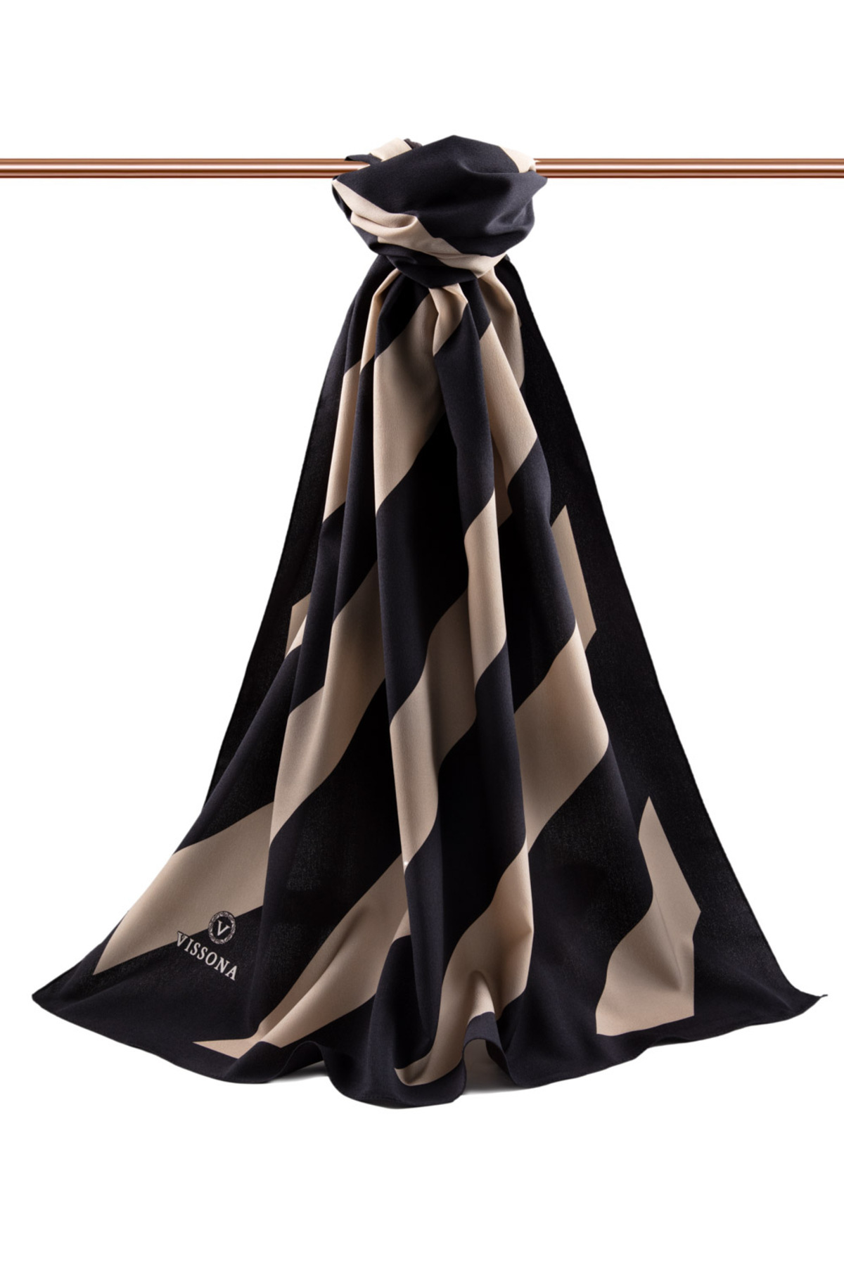 Lüks Medine Ipeği Çizgili Desenli Siyah - Bej Renkli 75x195 Kırışmaz Şal Moss Krep Dikiş Tipi Italya Lüks Medine Ipeği Çizgili Desenli Siyah - Bej Renkli 75x195 Kırışmaz Şal Moss Krep Dikiş Tipi Italya DGN50728 190 x 75
