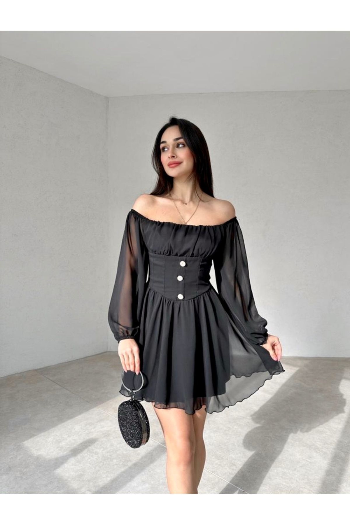 Vizon Dik Yakalı Sırt Dekolteli Piliseli Tül Kollu Mini Şifon Elbise Vizon Dik Yakalı Sırt Dekolteli Piliseli Tül Kollu Mini Şifon Elbise AFŞ-DKVZN L