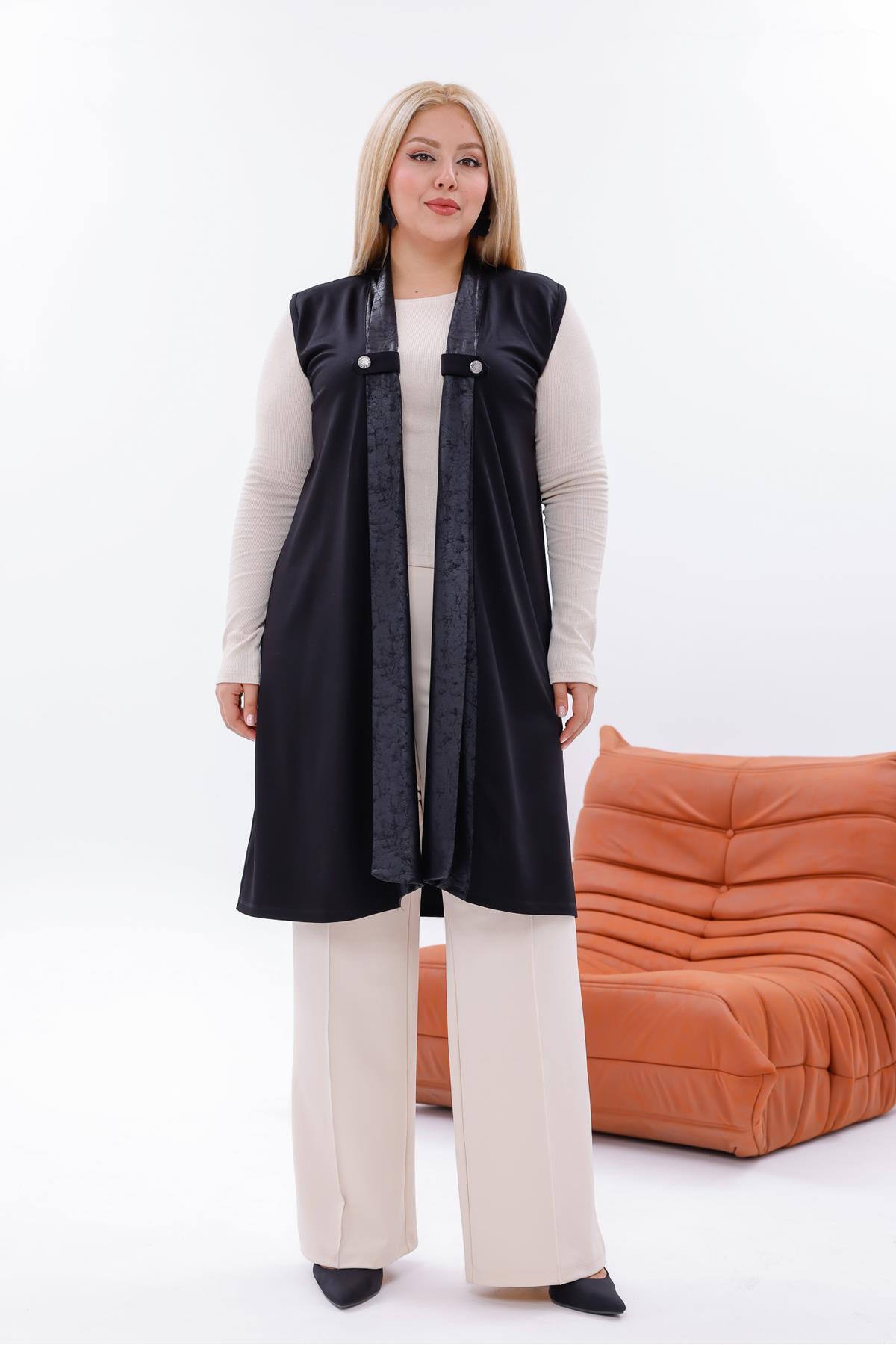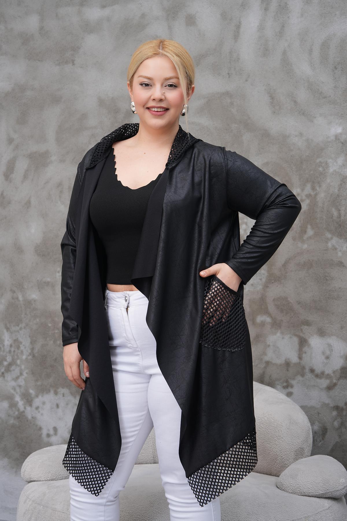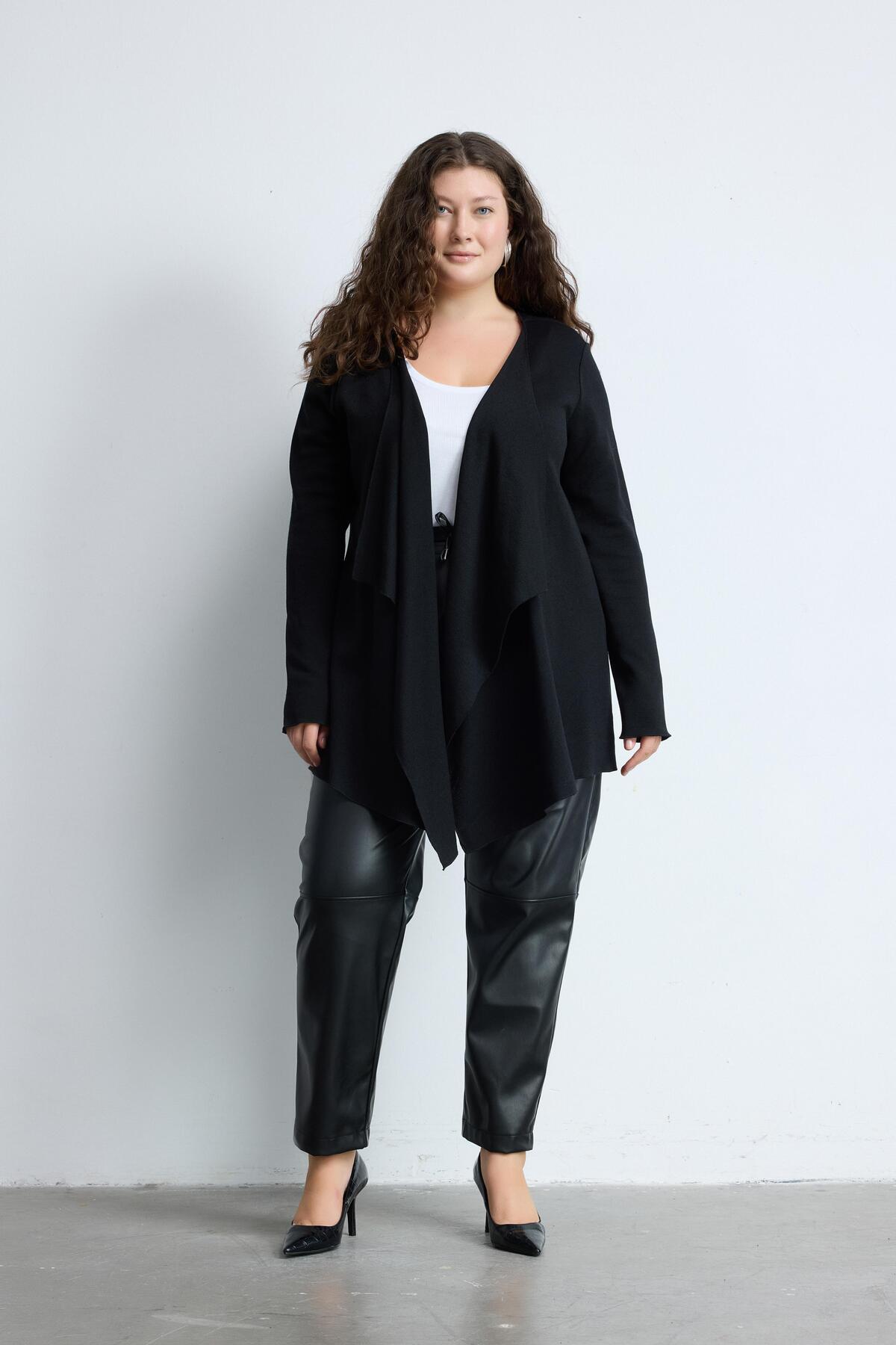 Siyah Büyük Beden Deri Kol Ve Cep Detay Şal Yaka Scuba Hırka Siyah Büyük Beden Deri Kol Ve Cep Detay Şal Yaka Scuba Hırka 23LB0039 42