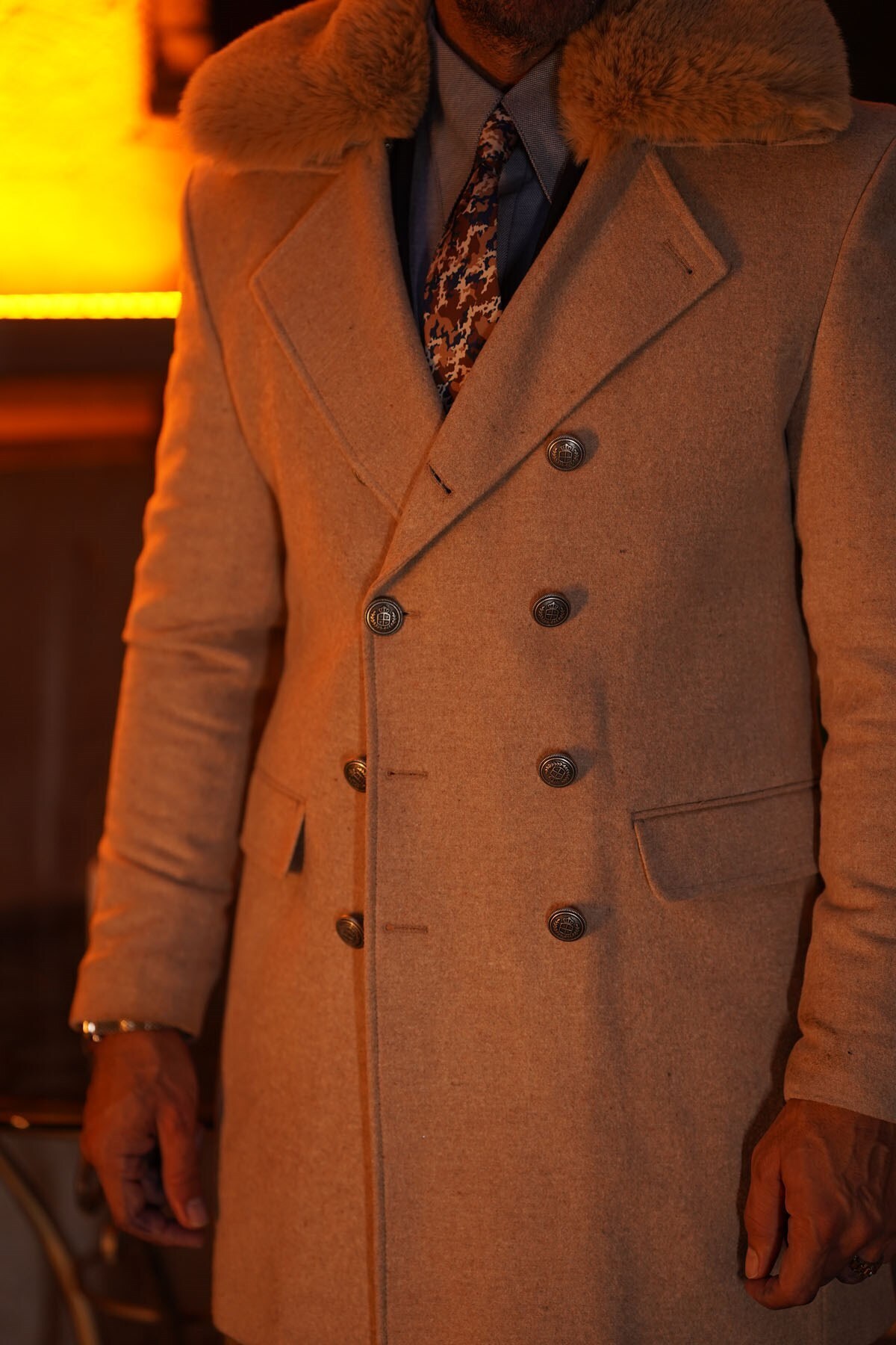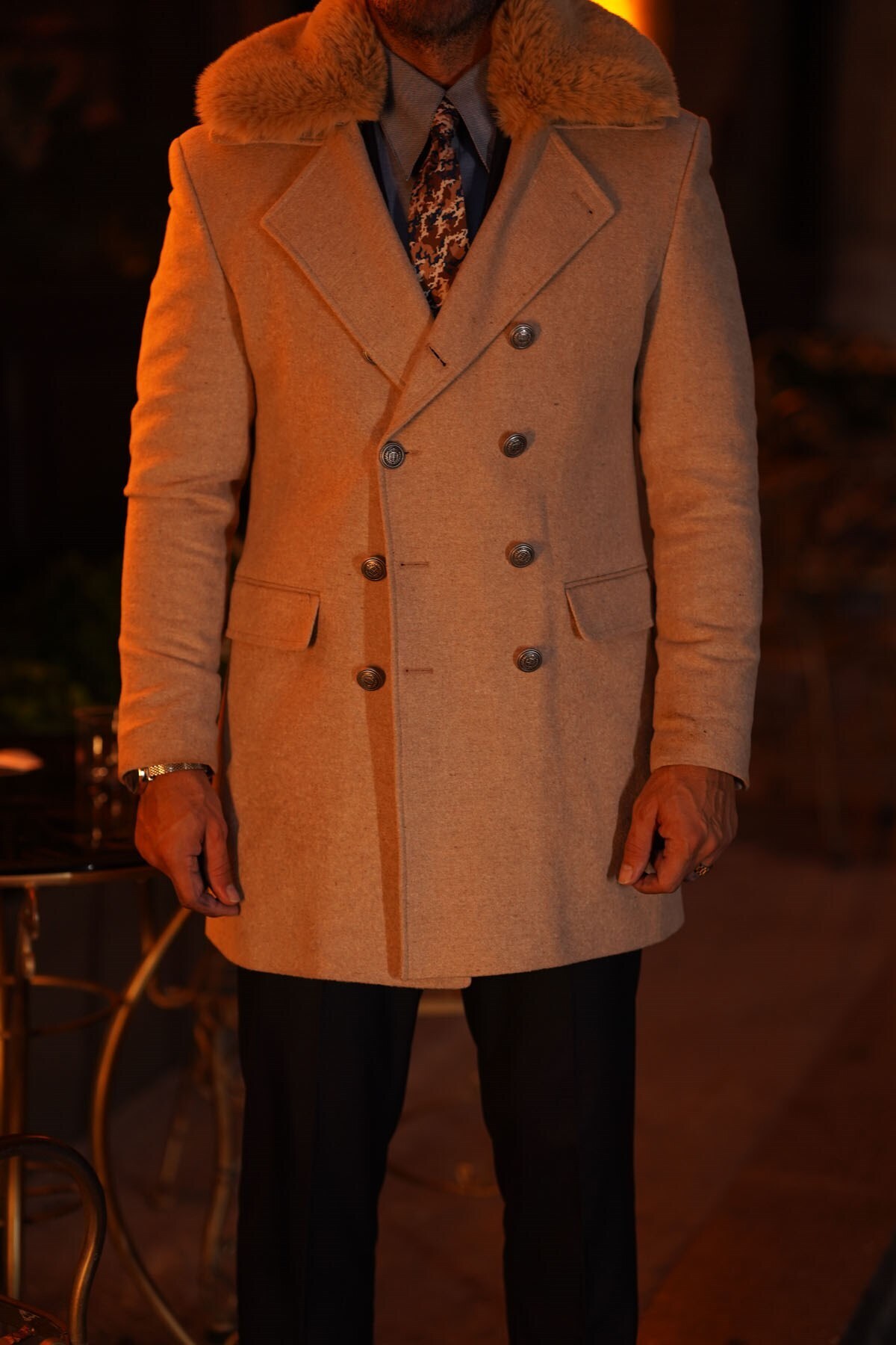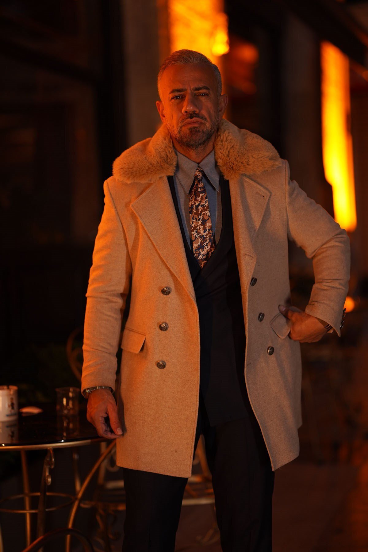 Bej Yakası Kürklü Kruvaze Kaşe Kaban Slim Fit Bej Yakası Kürklü Kruvaze Kaşe Kaban Slim Fit P232P71441 58
