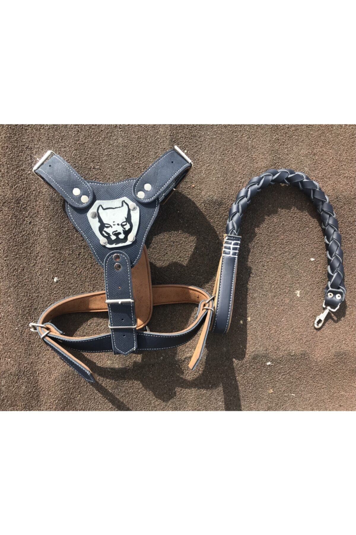Köpek Tasma Gladyatör Göğüs Tasma Büyük Boy+deri Örgü Gezdirme Lacivert