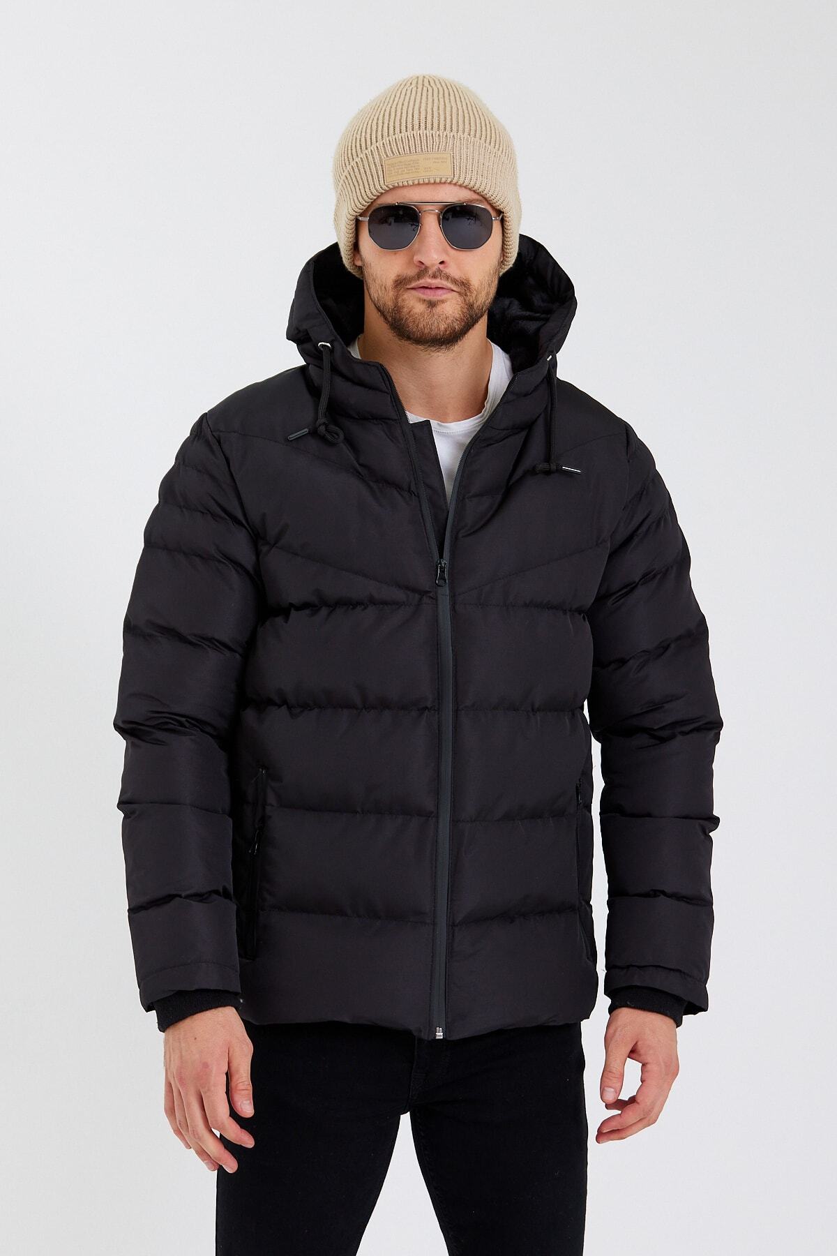 Erkek Siyah Dik Yaka Gizli Kapüşon Içi Kürklü Su Ve Rüzgar Geçirmez Kışlık Şişme Mont Erkek Siyah Dik Yaka Gizli Kapüşon Içi Kürklü Su Ve Rüzgar Geçirmez Kışlık Şişme Mont Kare1 2XL