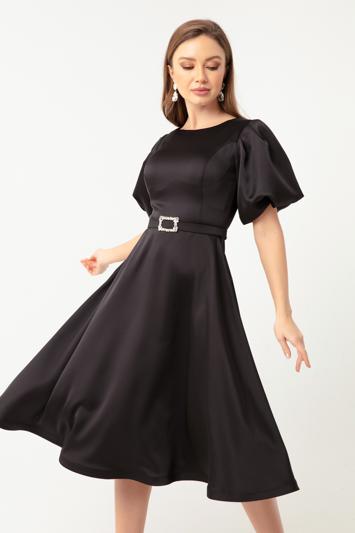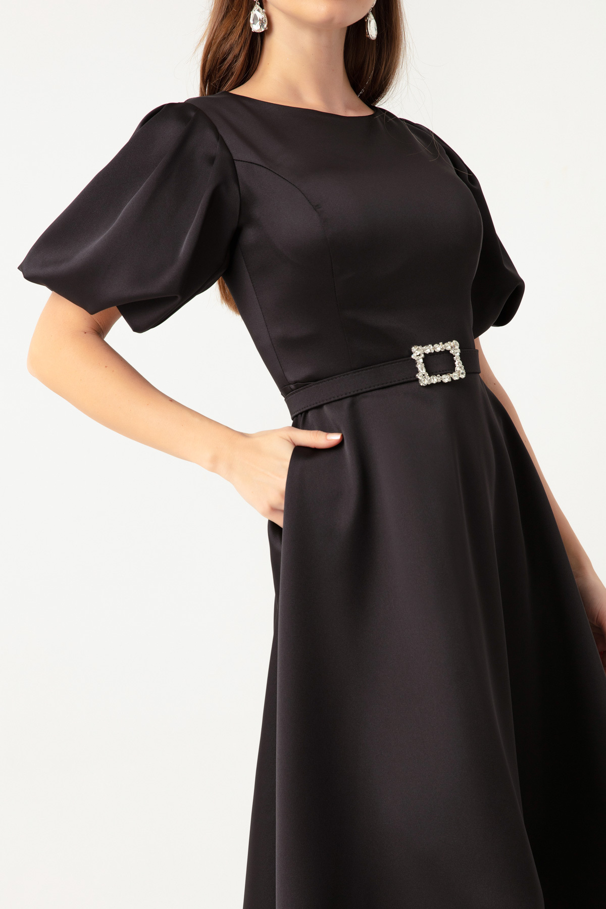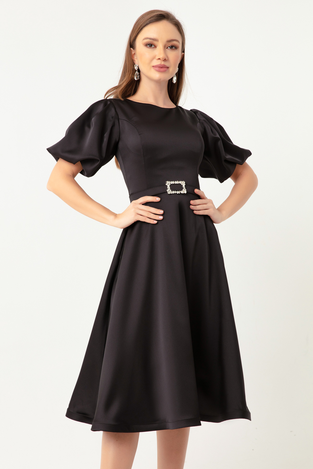 Kadın Siyah Balon Kollu Taşlı Kemerli Mini Saten Abiye Elbise Kadın Siyah Balon Kollu Taşlı Kemerli Mini Saten Abiye Elbise 22K262032 42