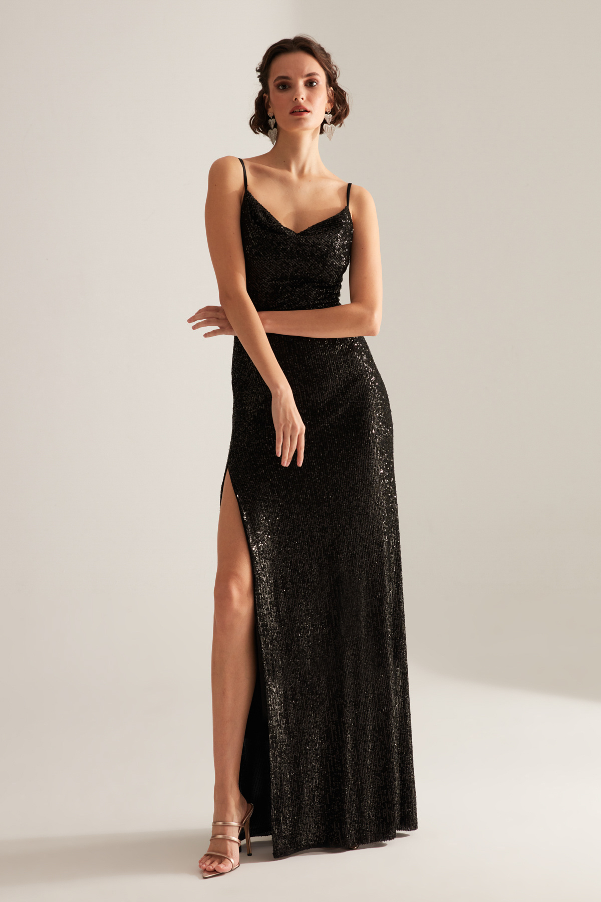 Askılı Degaje Yaka Yırtmaçlı Pullu Siyah Gece Elbisesi Askılı Degaje Yaka Yırtmaçlı Pullu Siyah Gece Elbisesi 5512 40