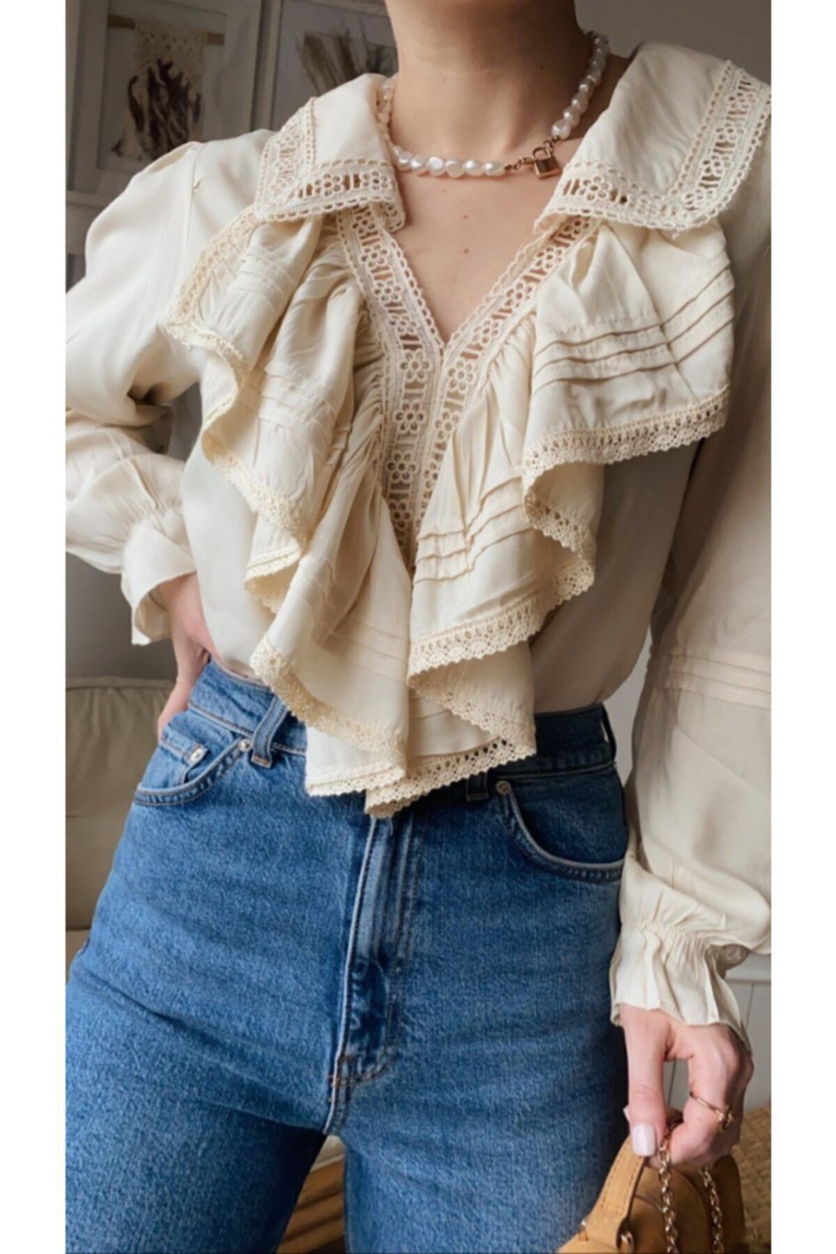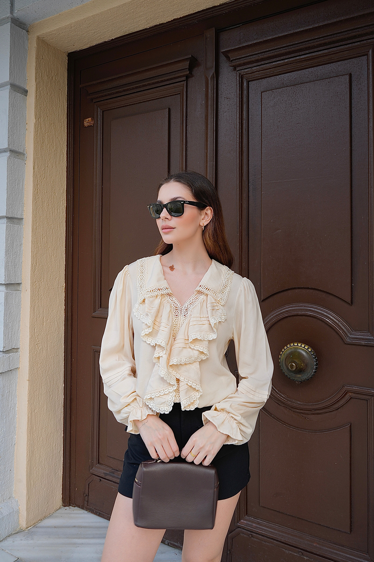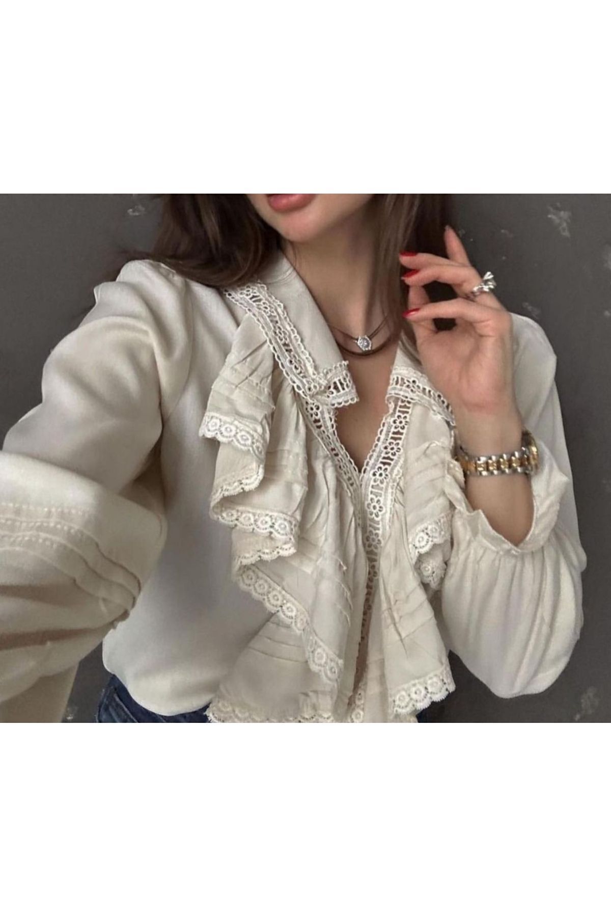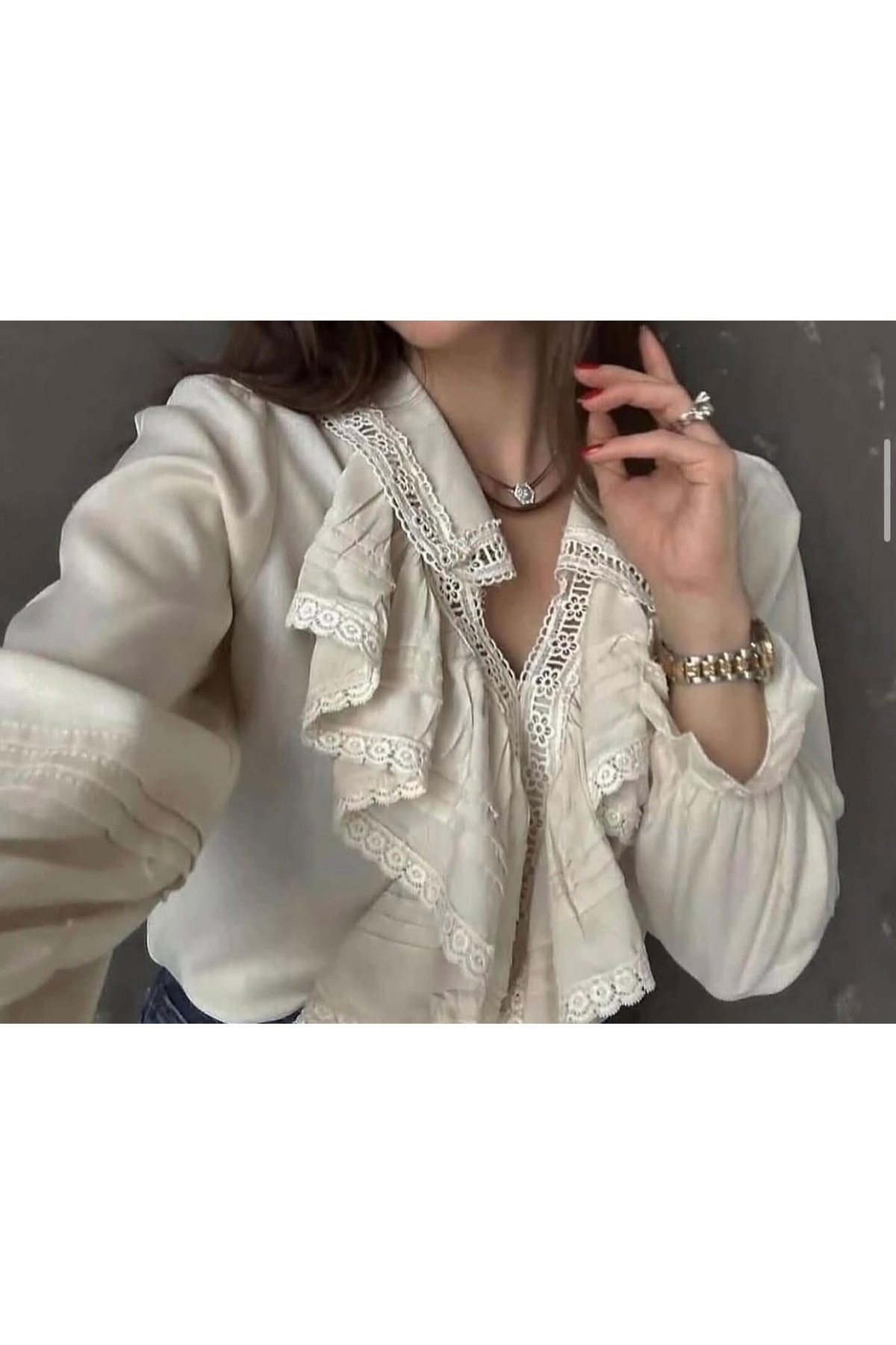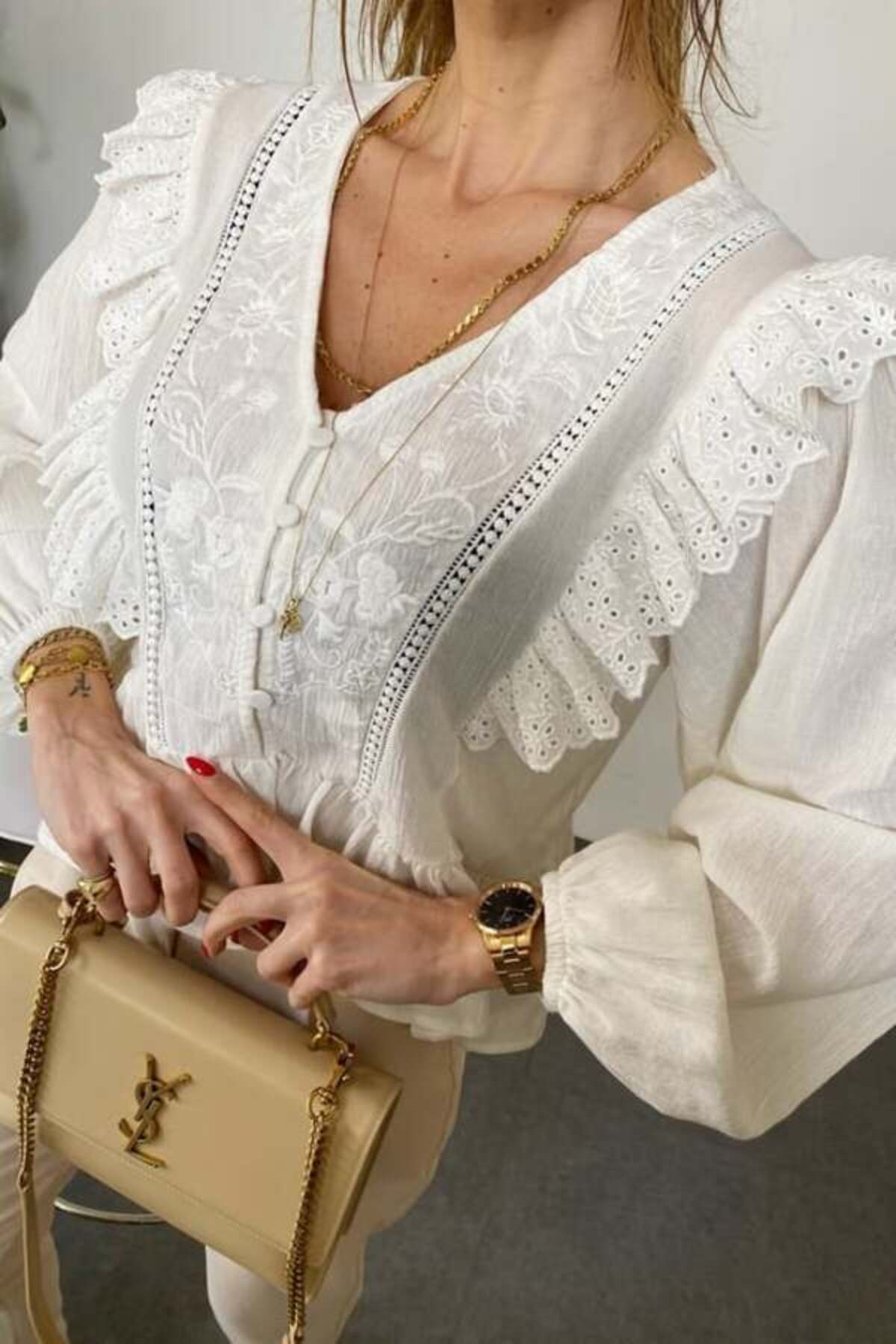 Fırfır Yaka Güpür Detaylı Cotton Bluz Fırfır Yaka Güpür Detaylı Cotton Bluz rodeobluz L