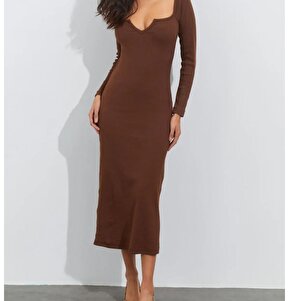Kadın Kahverengi V Yaka Maxi Kaşkorse Elbise EY1086 Kadın Kahverengi V Yaka Maxi Kaşkorse Elbise EY1086 M