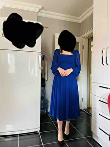 Kadın Saks Kare Yaka Kemerli Midi Şifon Abiye Elbise Kadın Saks Kare Yaka Kemerli Midi Şifon Abiye Elbise 23Y262033 42
