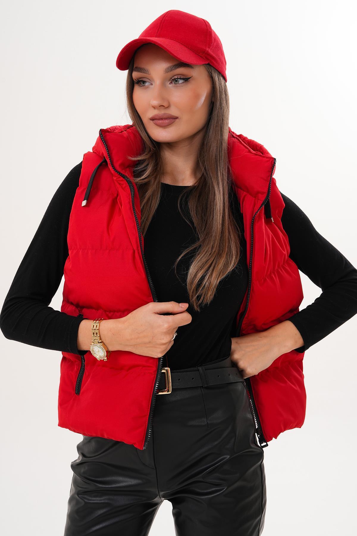 Kadın Kırmızı Kapüşonlu Şişme Yelek Kapüşon İçi Polar Kadın Kırmızı Kapüşonlu Şişme Yelek Kapüşon İçi Polar 5000 2XL
