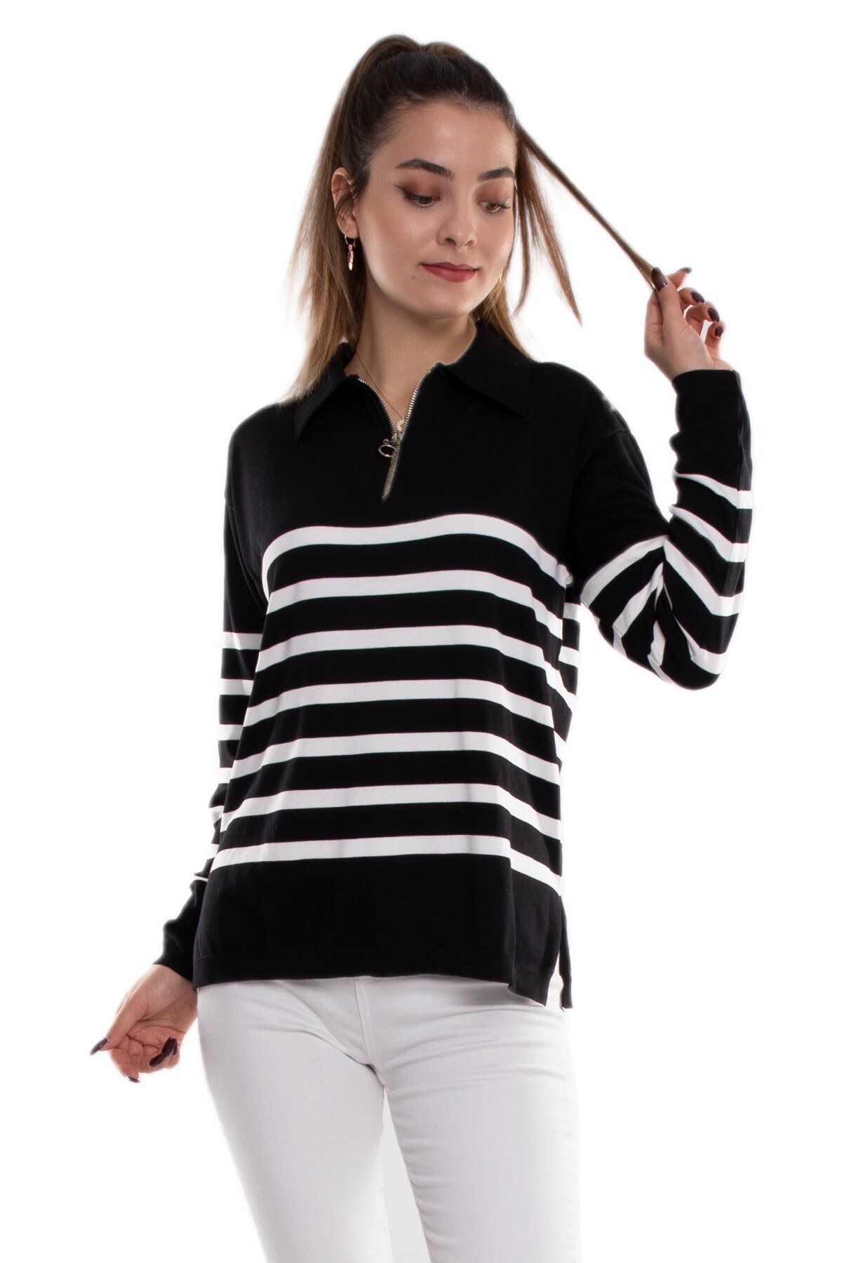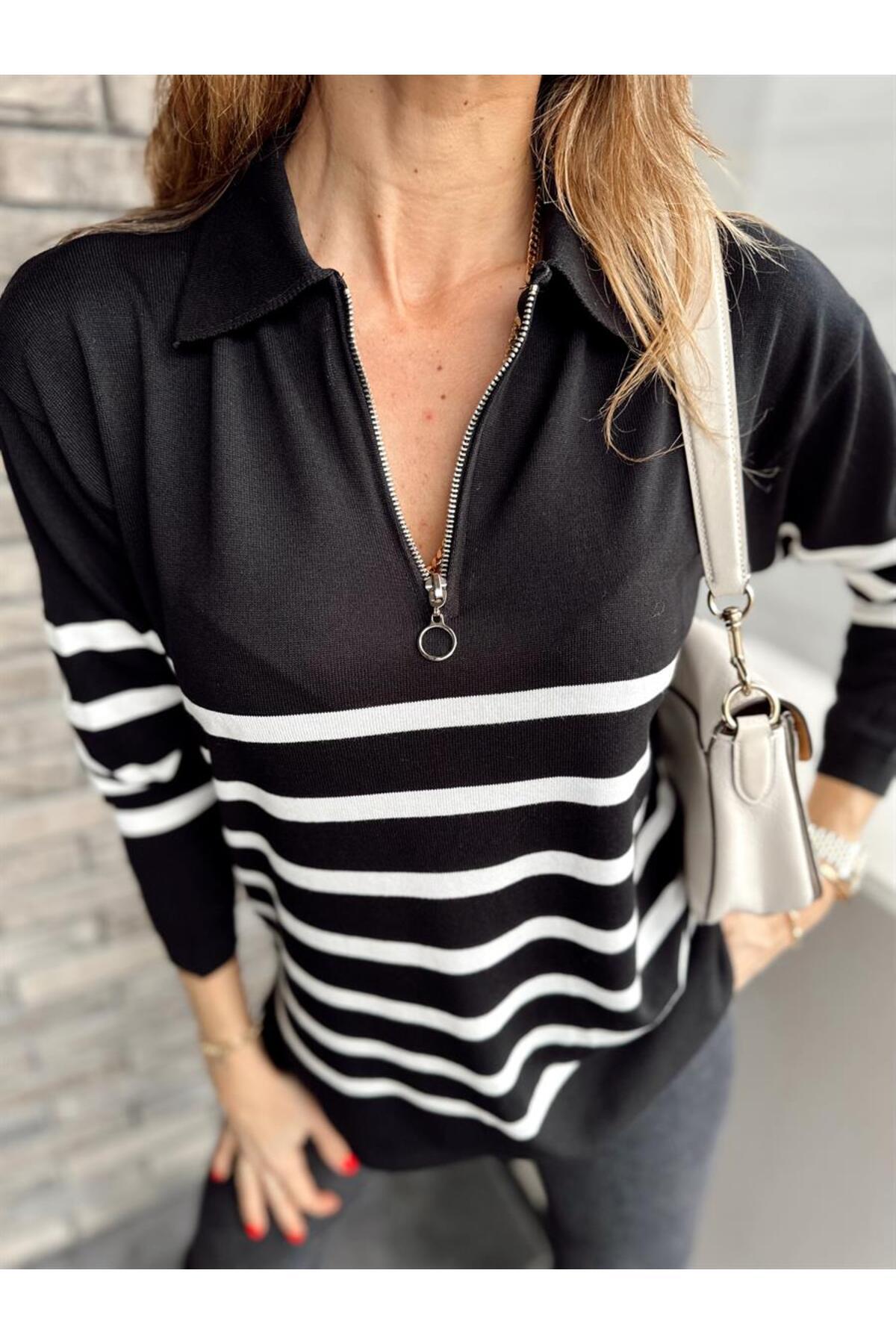 Kadın Gömlek Yaka Fermuarlı Merserize Beyaz Çizgili Siyah Triko Kazak Kadın Gömlek Yaka Fermuarlı Merserize Beyaz Çizgili Siyah Triko Kazak 23FK002401 Standart