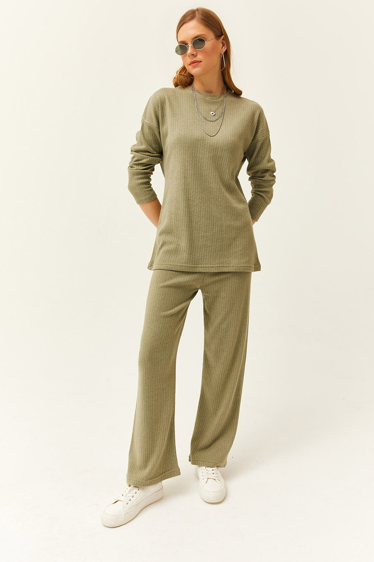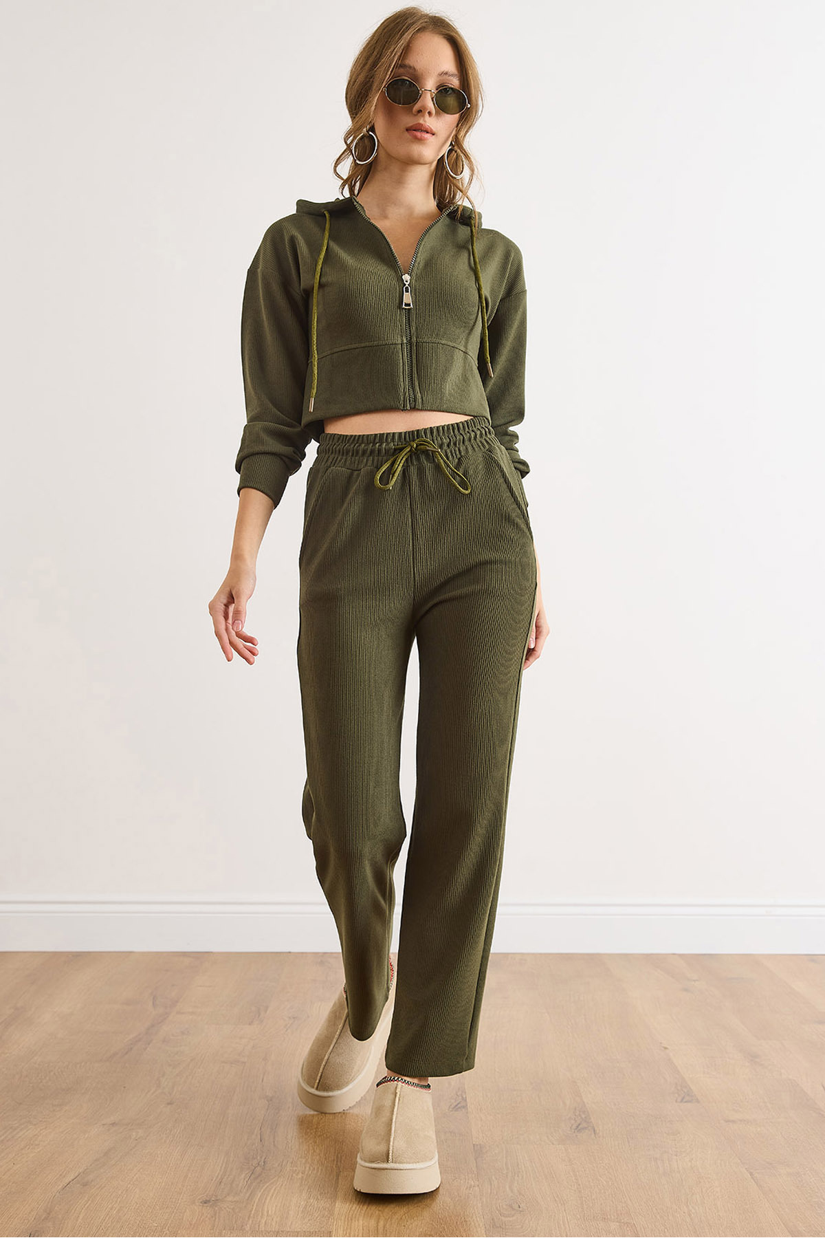 Kadın Haki Üst Yırtmaçlı Bluz Alt Palazzo Fitilli Takım TKM-19000180 Kadın Haki Üst Yırtmaçlı Bluz Alt Palazzo Fitilli Takım TKM-19000180 XL