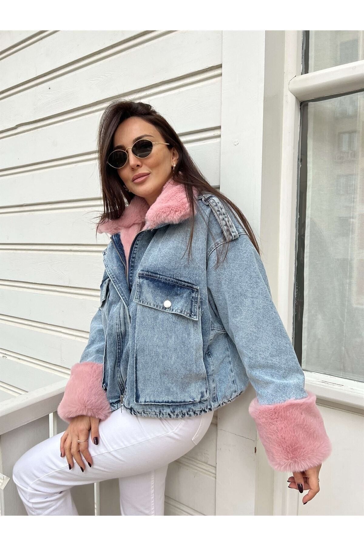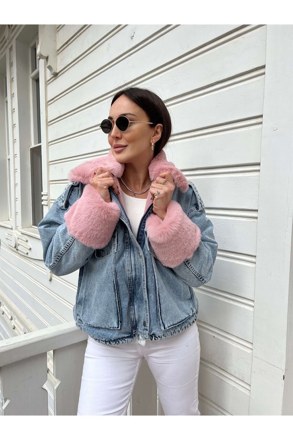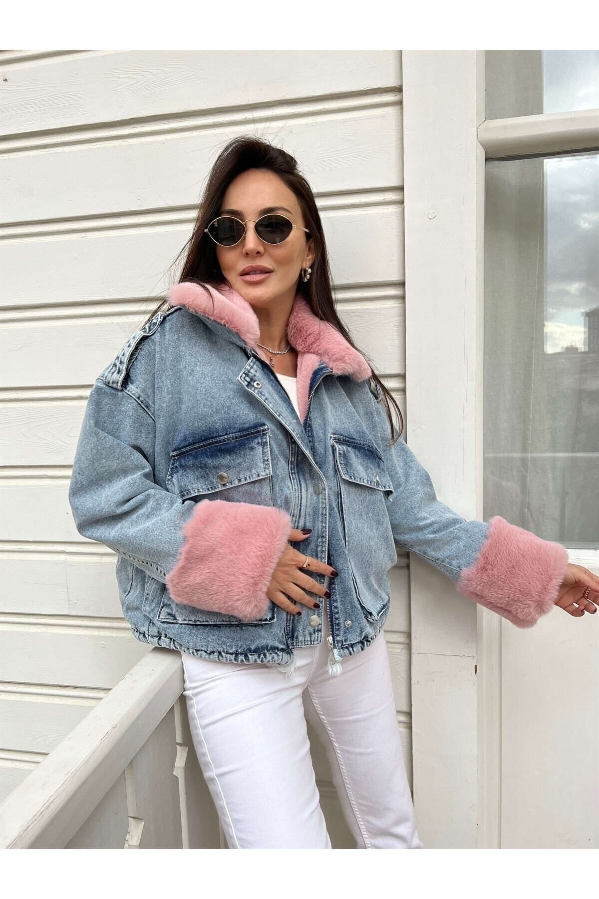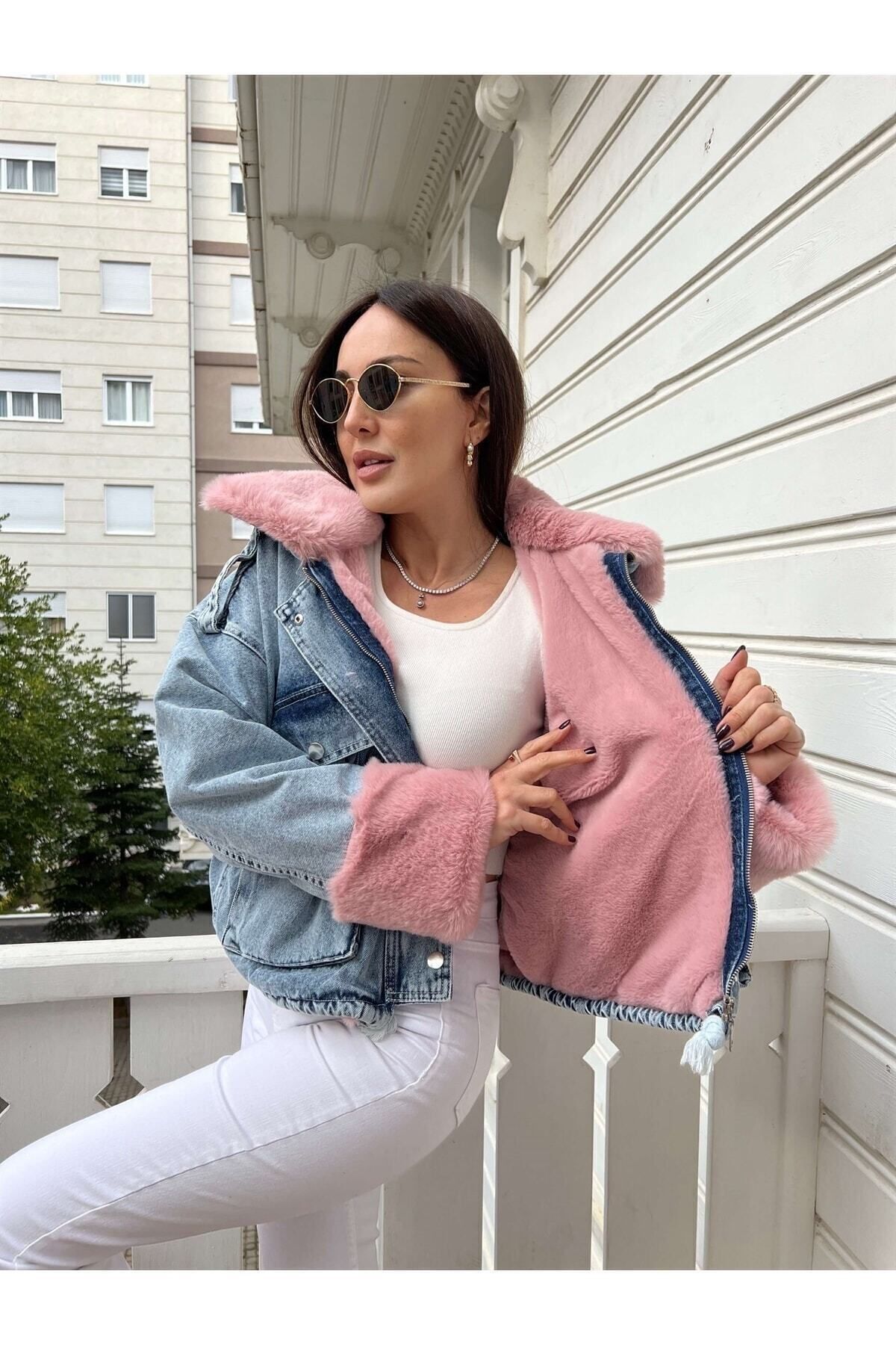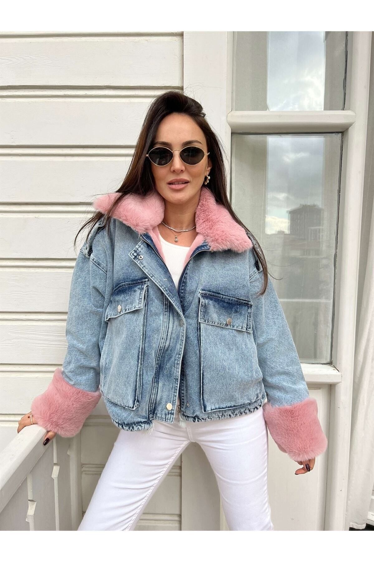 Kadın Pembe Kürklü Denim Kadın Mont Kadın Pembe Kürklü Denim Kadın Mont 10966 Standart