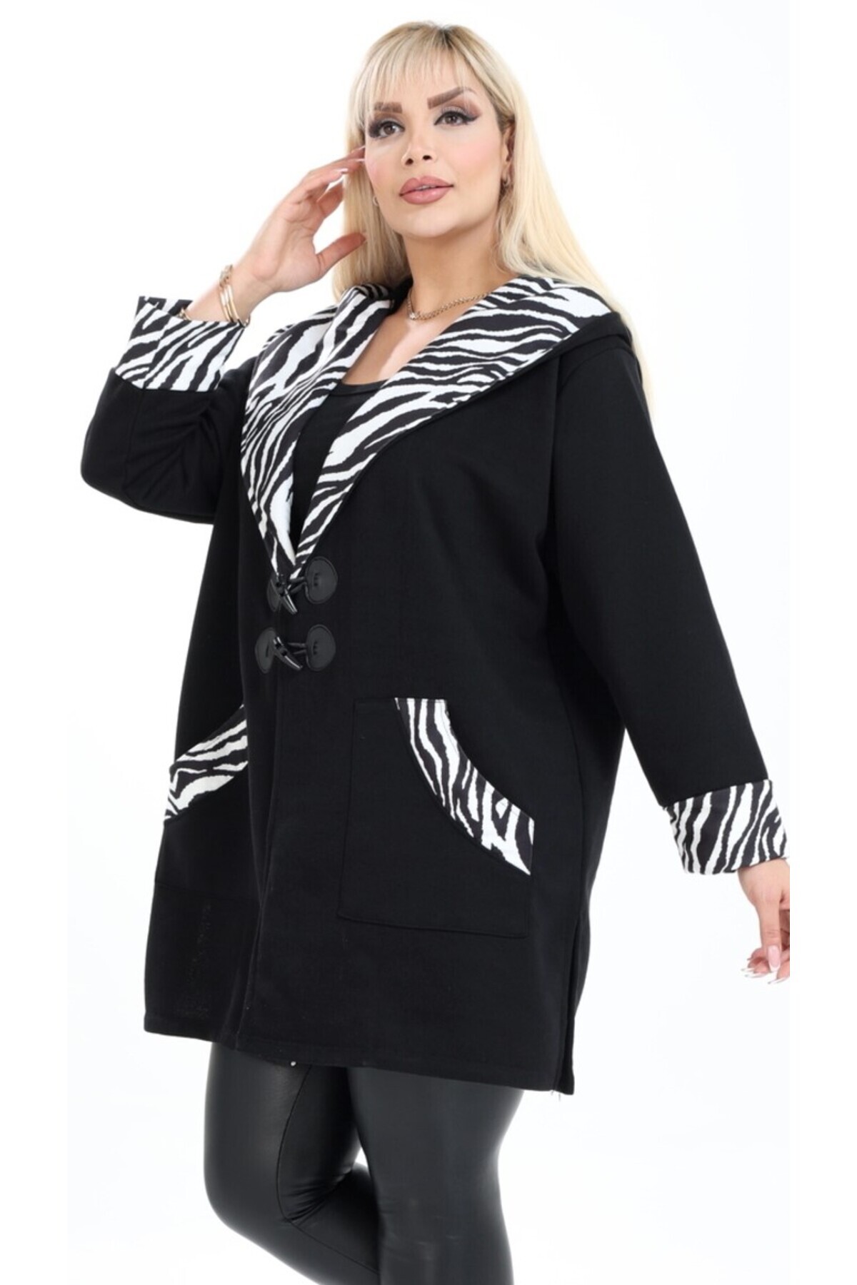 Zebra Desen Detaylı Kapüşonlu Cepli Dökümlü Esnek Tarz Hırka Zebra Desen Detaylı Kapüşonlu Cepli Dökümlü Esnek Tarz Hırka KHS-10920 52-54