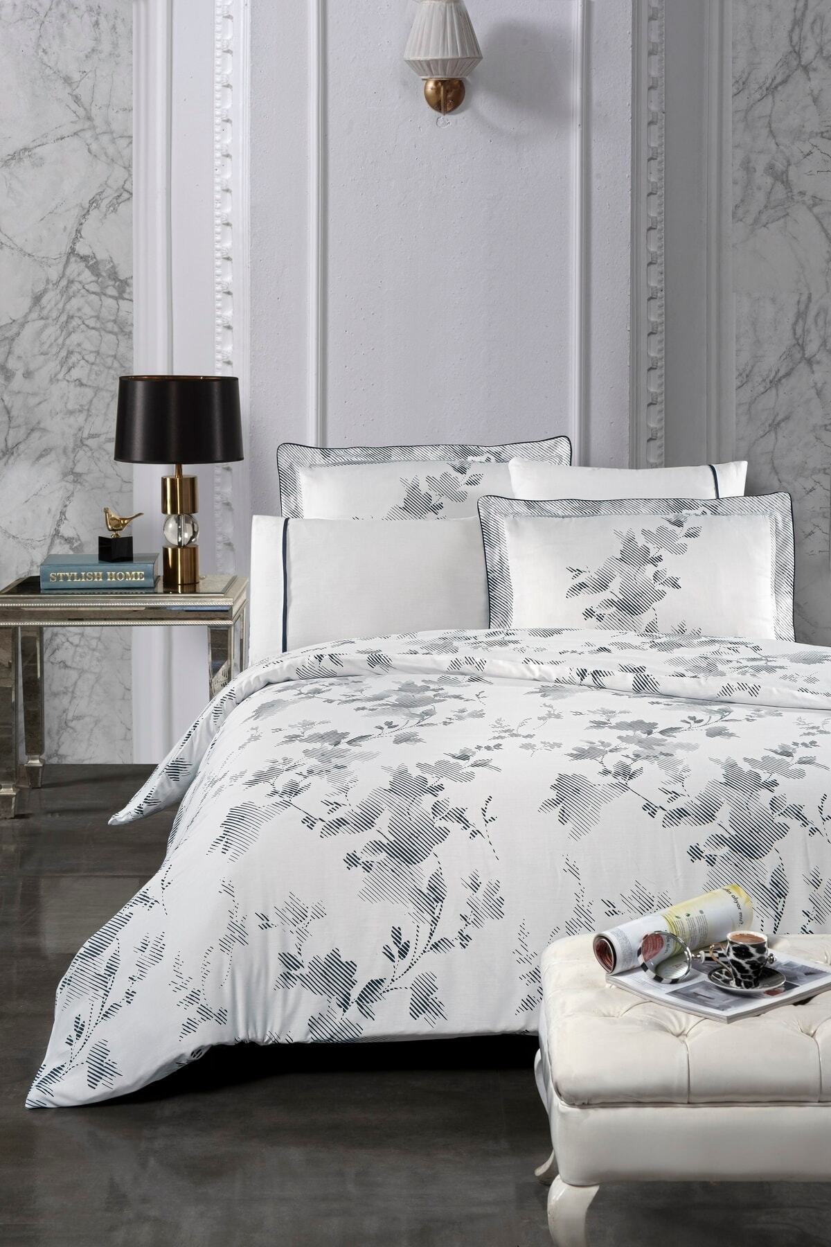 Pamuk Saten Nevresim Takımı Florentina Tek Kişilik, Beyaz Siyah Çizgili ve Çiçek Desenli, Lastikli Pamuk Saten Nevresim Takımı Florentina Tek Kişilik, Beyaz Siyah Çizgili ve Çiçek Desenli, Lastikli RTN005 تک سایز