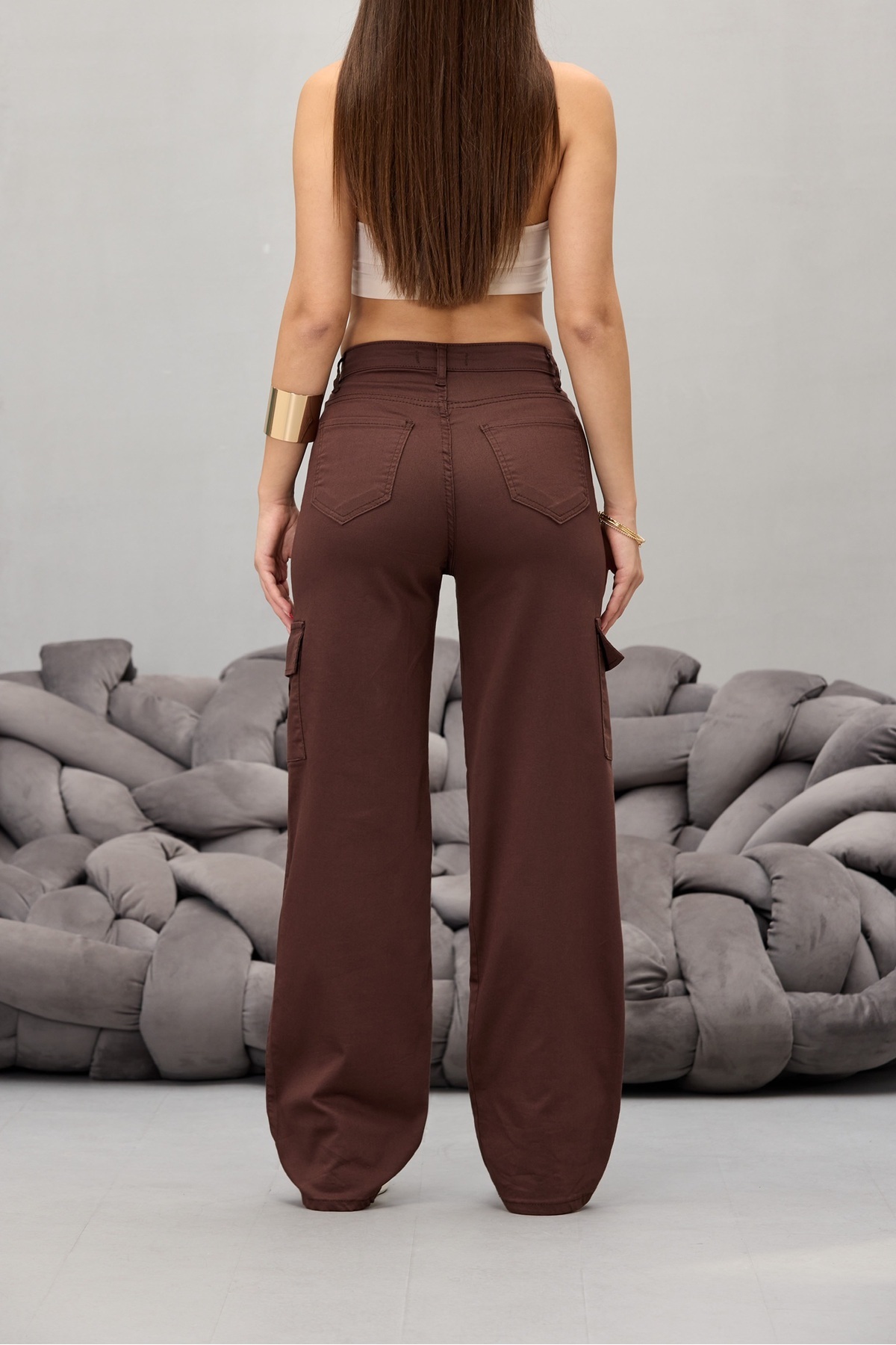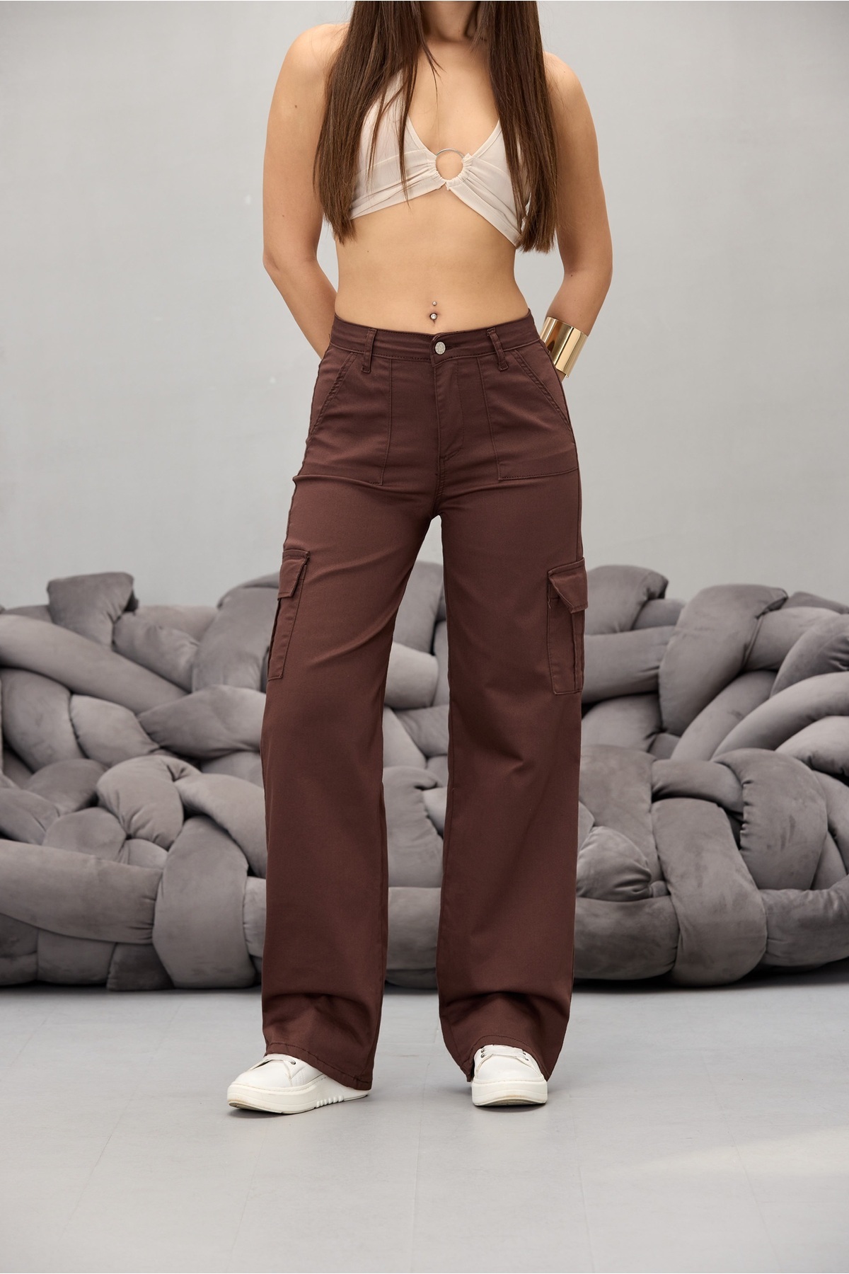 Kahve Kargo Cepli Likralı Yüksek Bel Wide Leg Pantolon Kahve Kargo Cepli Likralı Yüksek Bel Wide Leg Pantolon BKL0000010022 XL