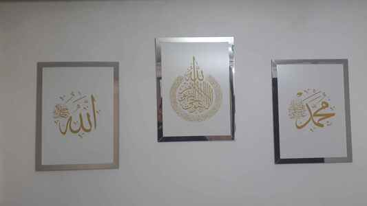 Gümüş Aynalı Pleksi Çerçeveli Hz Muhammed Ve Allah Lafzı Üçlü Mdf Tablo Seti Gümüş Aynalı Pleksi Çerçeveli Hz Muhammed Ve Allah Lafzı Üçlü Mdf Tablo Seti 3MPTMGP435 50 x 70