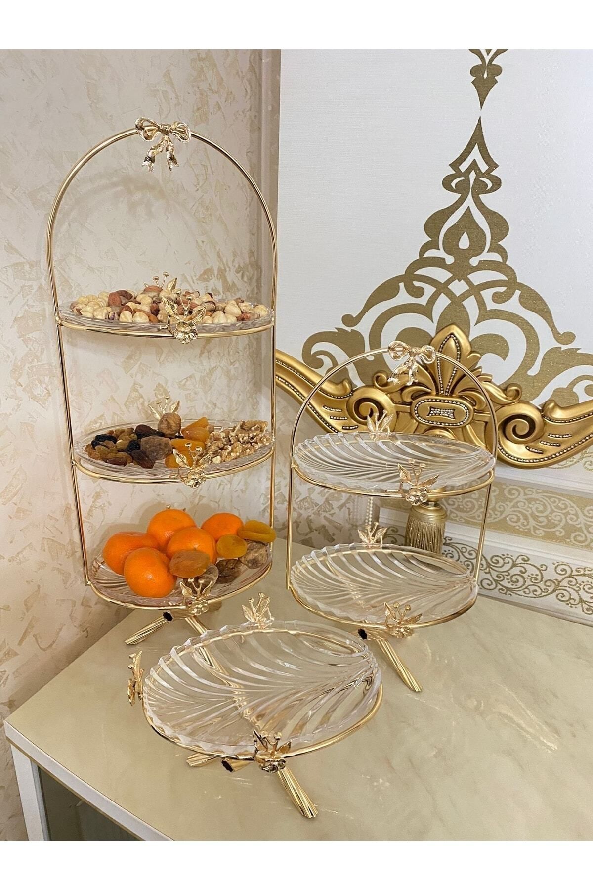 Üç Katlı Altın Varaklı Sunumluk Kurabiyelik Meyvelik Üç Katlı Altın Varaklı Sunumluk Kurabiyelik Meyvelik TYC00720851364 تک سایز