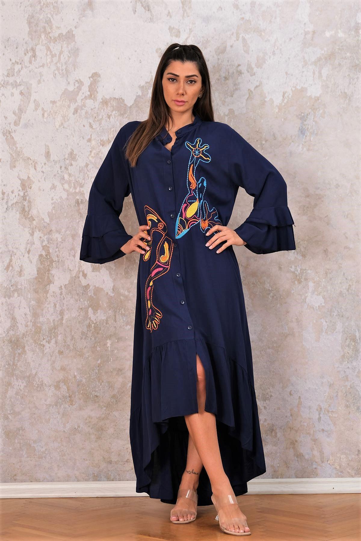 Kadın Lacivert Dik Yaka Kol Ve Etek Ucu Fırfırlı Cepli Nakışlı Oversize Uzun Elbise Kadın Lacivert Dik Yaka Kol Ve Etek Ucu Fırfırlı Cepli Nakışlı Oversize Uzun Elbise EUW2AF8140 48