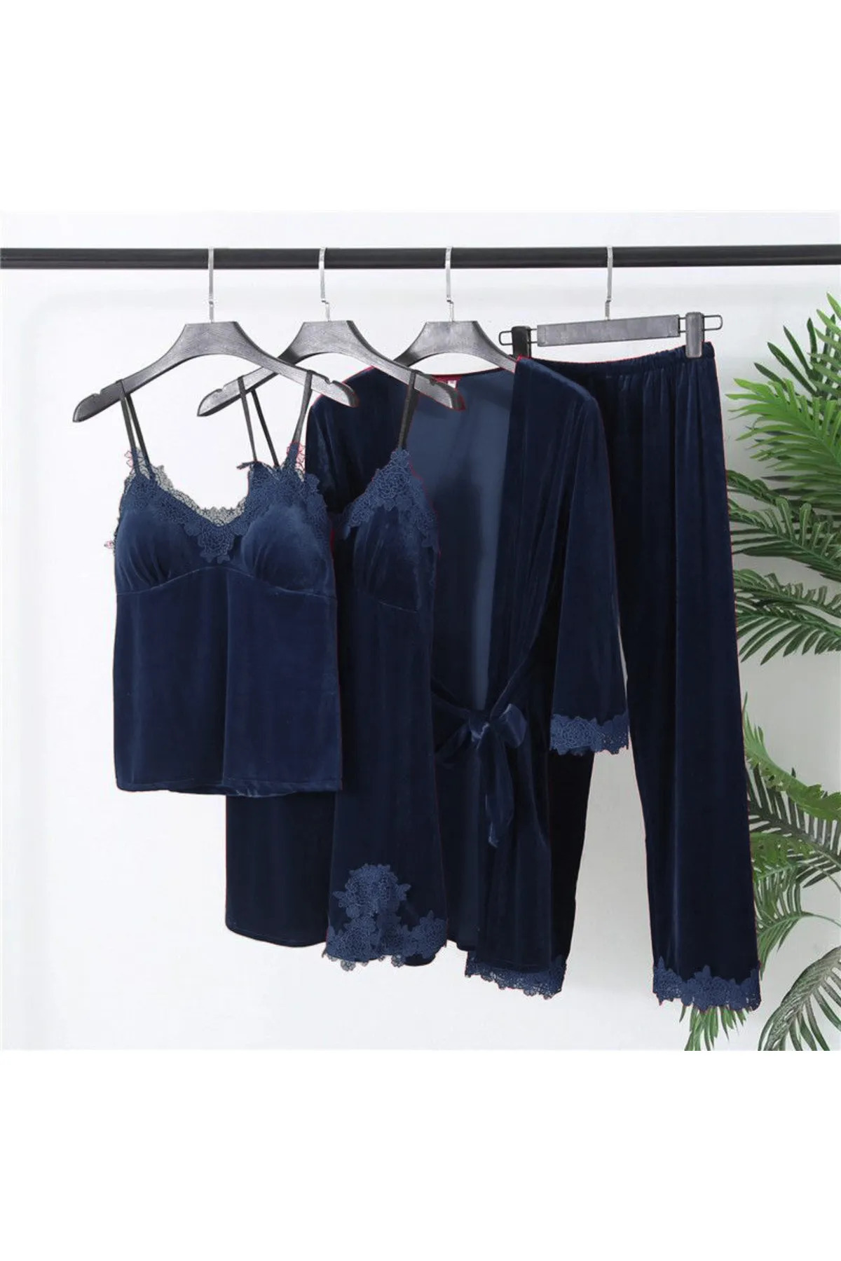 Kadife Dantelli Lacivert Dörtlü Gecelik Sabahlık Takımı Laci Kadife Dantelli Lacivert Dörtlü Gecelik Sabahlık Takımı Laci p-44444 3XL