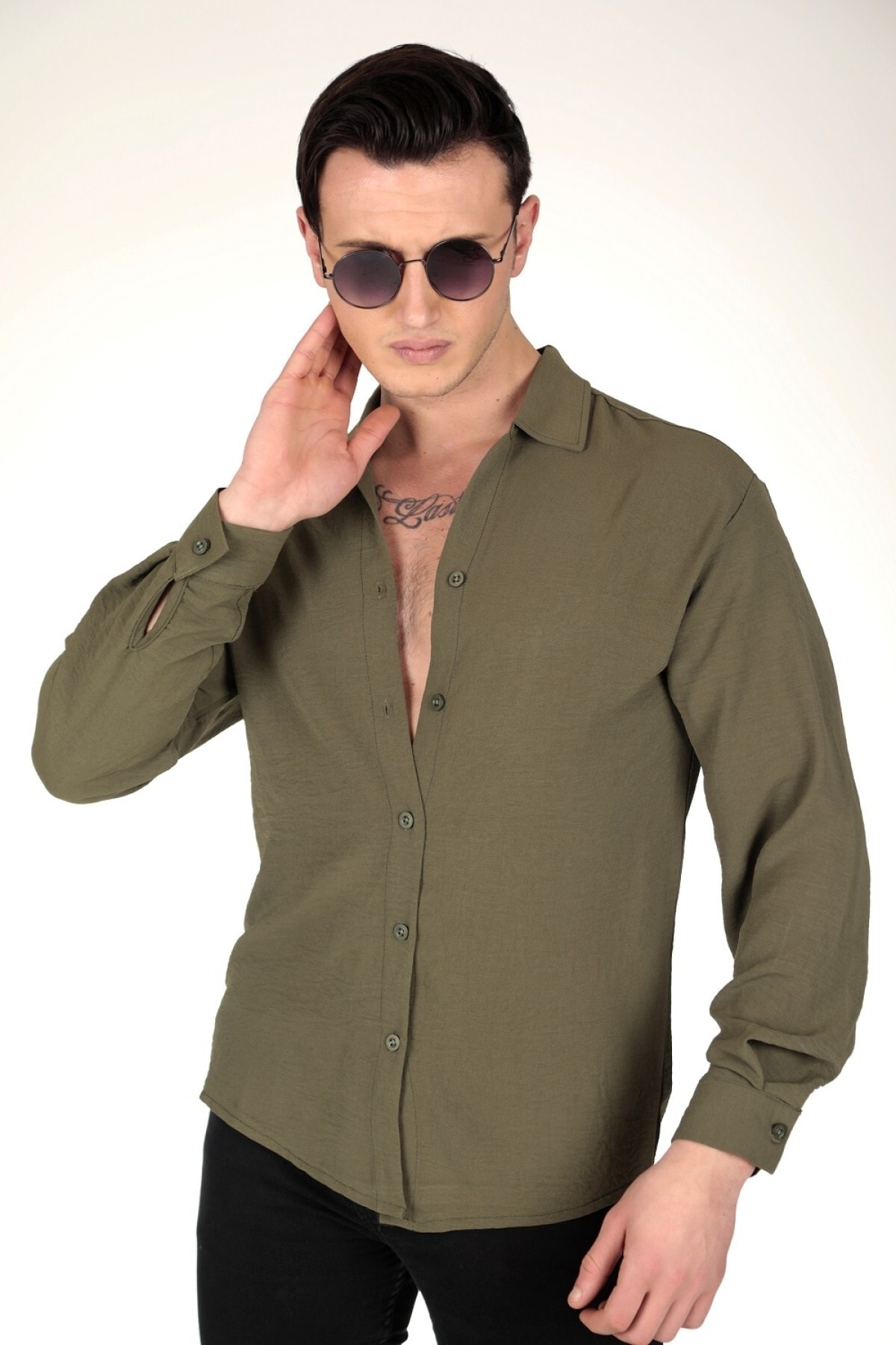Erkek Dokulu Aerobin Haki Keten Oversize Gömlek Erkek Dokulu Aerobin Haki Keten Oversize Gömlek GMLK1-21 XL