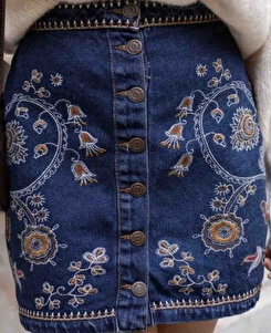 Önden Düğmeli Nakış Işlemeli Ünlü Markanın Orjinali Lacivert Mini Denim Etek Önden Düğmeli Nakış Işlemeli Ünlü Markanın Orjinali Lacivert Mini Denim Etek 3Y050 42