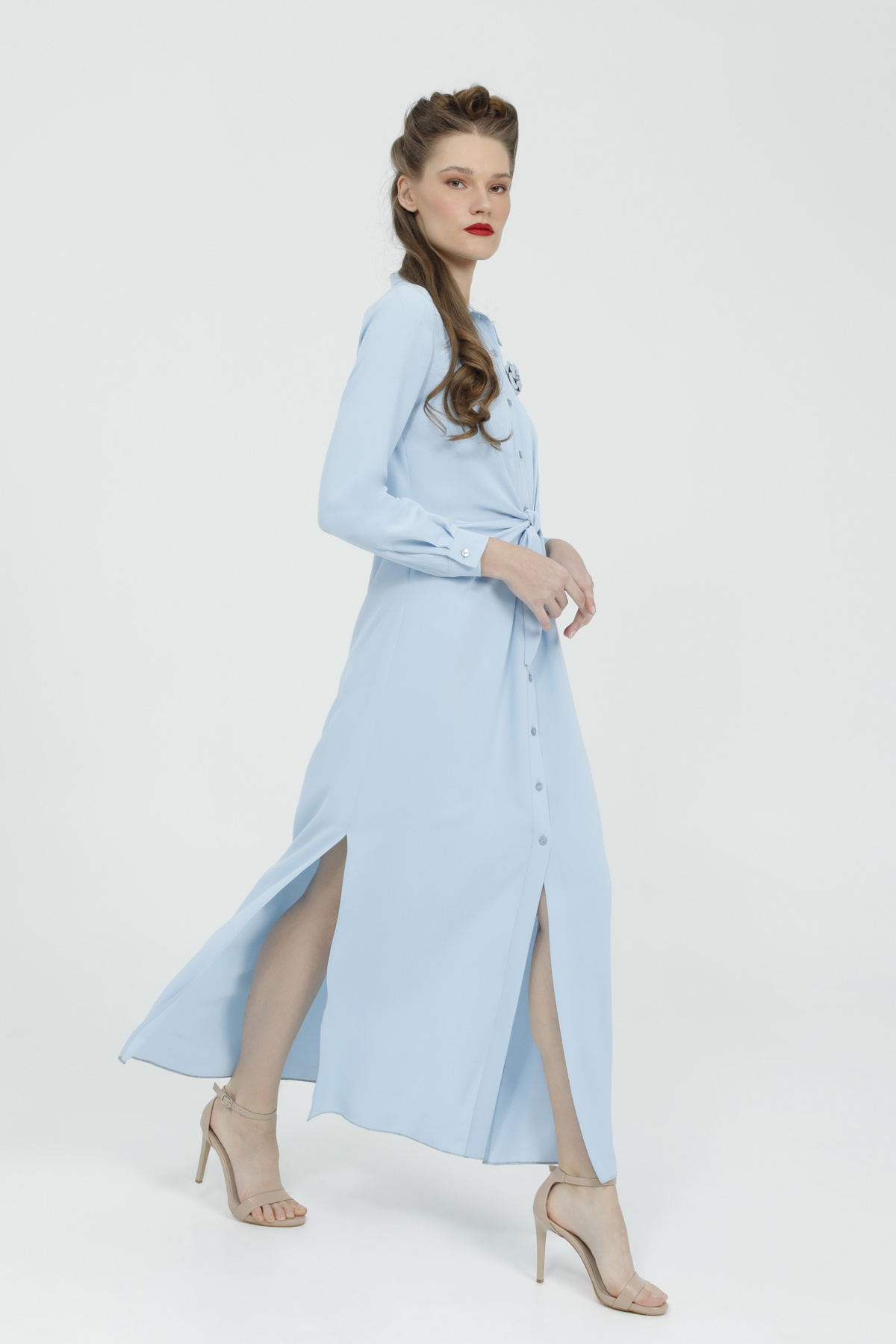 Yakası Işleme Detaylı Yandan Yırtmaçlı Dökümlü Siyah Krep Elbise Yakası Işleme Detaylı Yandan Yırtmaçlı Dökümlü Siyah Krep Elbise M2KMZG0441 42