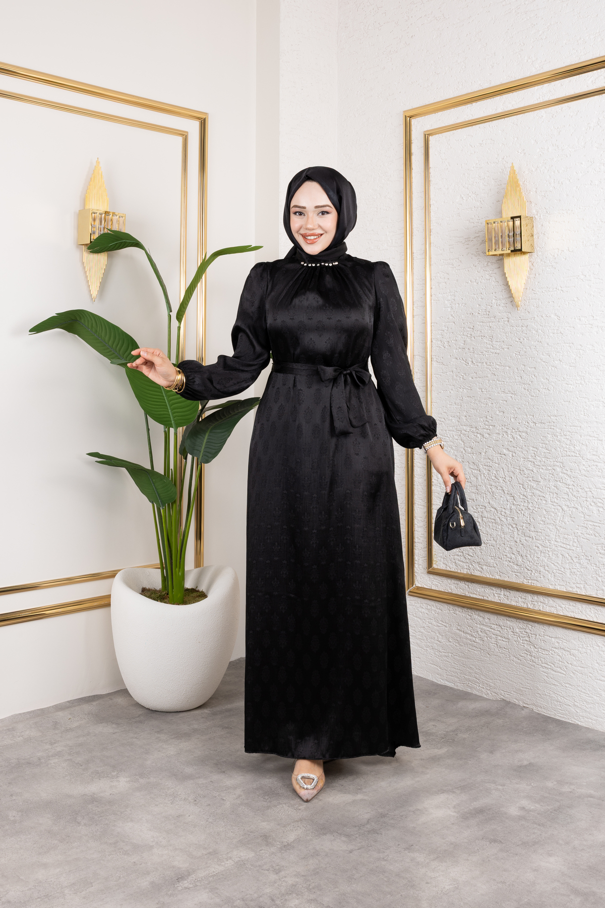 KADIN SİYAH TAŞ DETAYLI BÜZGÜLÜ ABİYE ELBİSE T 6873 KADIN SİYAH TAŞ DETAYLI BÜZGÜLÜ ABİYE ELBİSE T 6873 23YELBTR6873 40